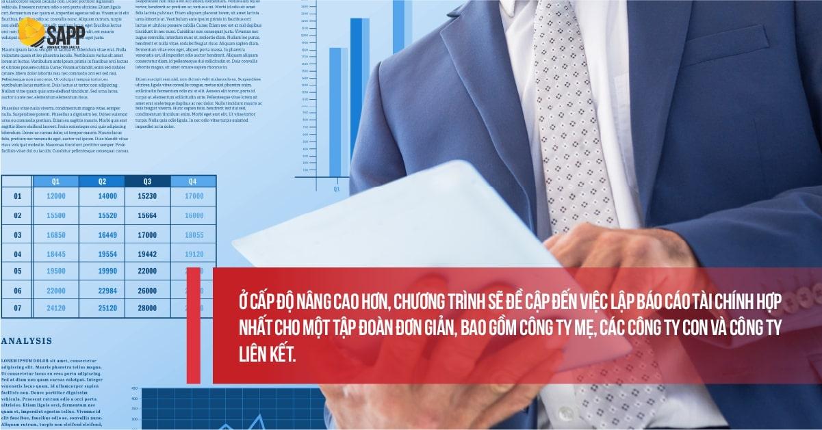 Ở cấp độ nâng cao hơn, chương trình sẽ đề cập đến việc lập báo cáo tài chính hợp nhất cho một tập đoàn đơn giản, bao gồm công ty mẹ, các công ty con và công ty liên kết.