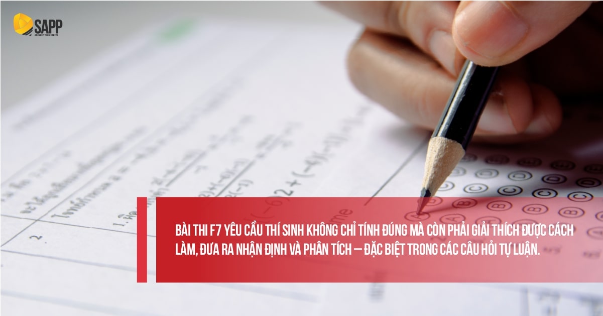 3. Thứ ba, kỹ năng trình bày rõ ràng, mạch lạc là một lợi thế. Bài thi F7 yêu cầu thí sinh không chỉ tính đúng mà còn phải giải thích được cách làm, đưa ra nhận định và phân tích bằng lời – đặc biệt trong các câu hỏi tự luận.