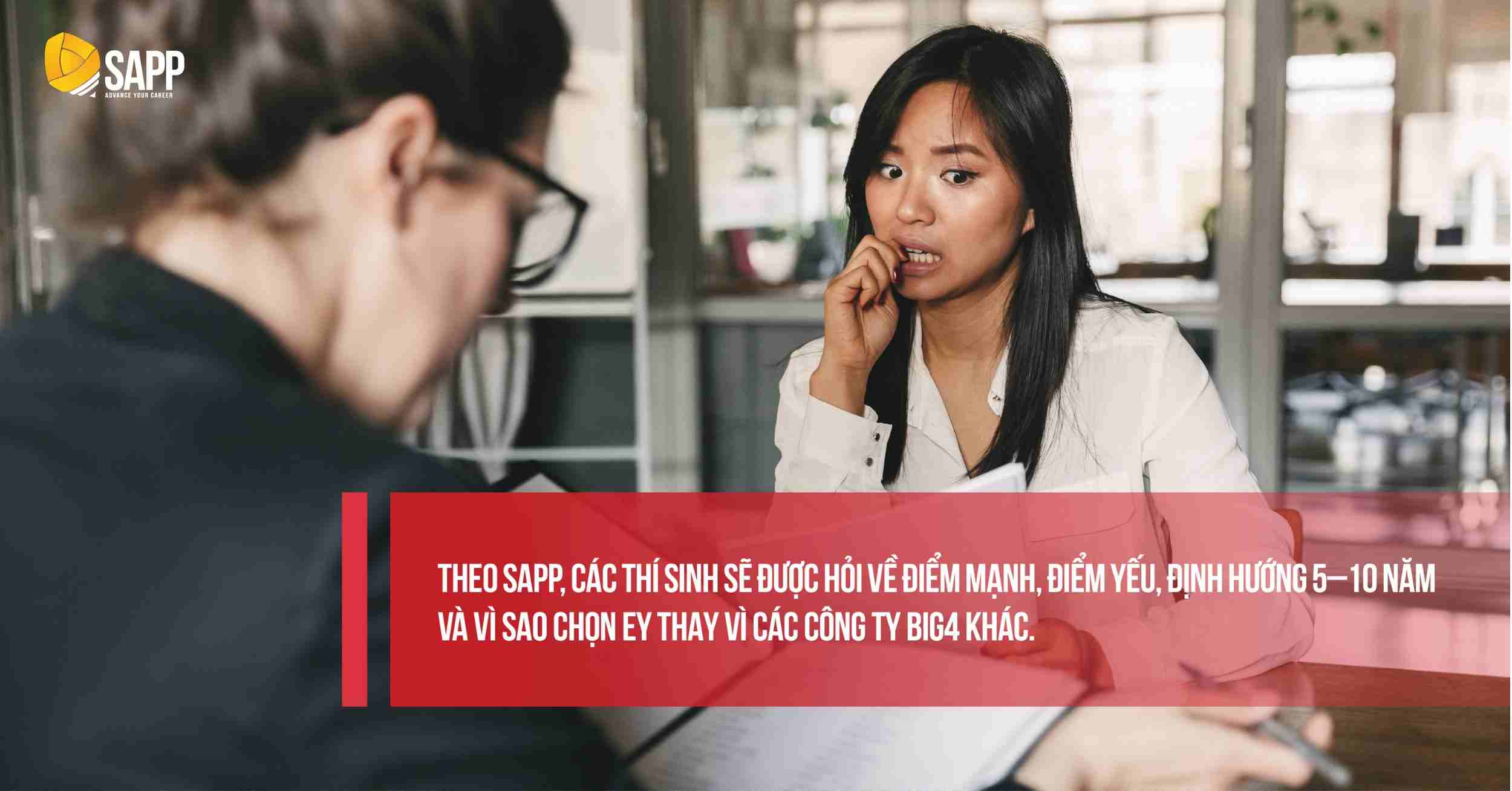 Câu hỏi kỹ thuật có thể được đặt ra nếu bạn có nền tảng kỹ năng phù hợp; nếu không, phỏng vấn sẽ chuyển sang ngữ cảnh cá nhân và tình huống. Theo SAPP, các thí sinh từng được hỏi về điểm mạnh, điểm yếu, định hướng 5 – 10 năm và vì sao chọn EY thay vì các công ty Big4 khác.