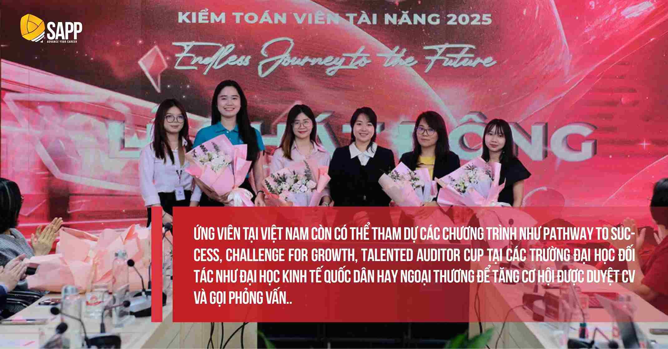 Bên cạnh đó, ứng viên tại Việt Nam còn có thể tham dự các chương trình như Pathway to Success, Challenge for Growth, Talent Auditor Cup tại các trường đại học đối tác như Đại học Kinh tế Quốc dân hay Ngoại thương – giúp tăng cơ hội được duyệt CV và gọi phỏng vấn.