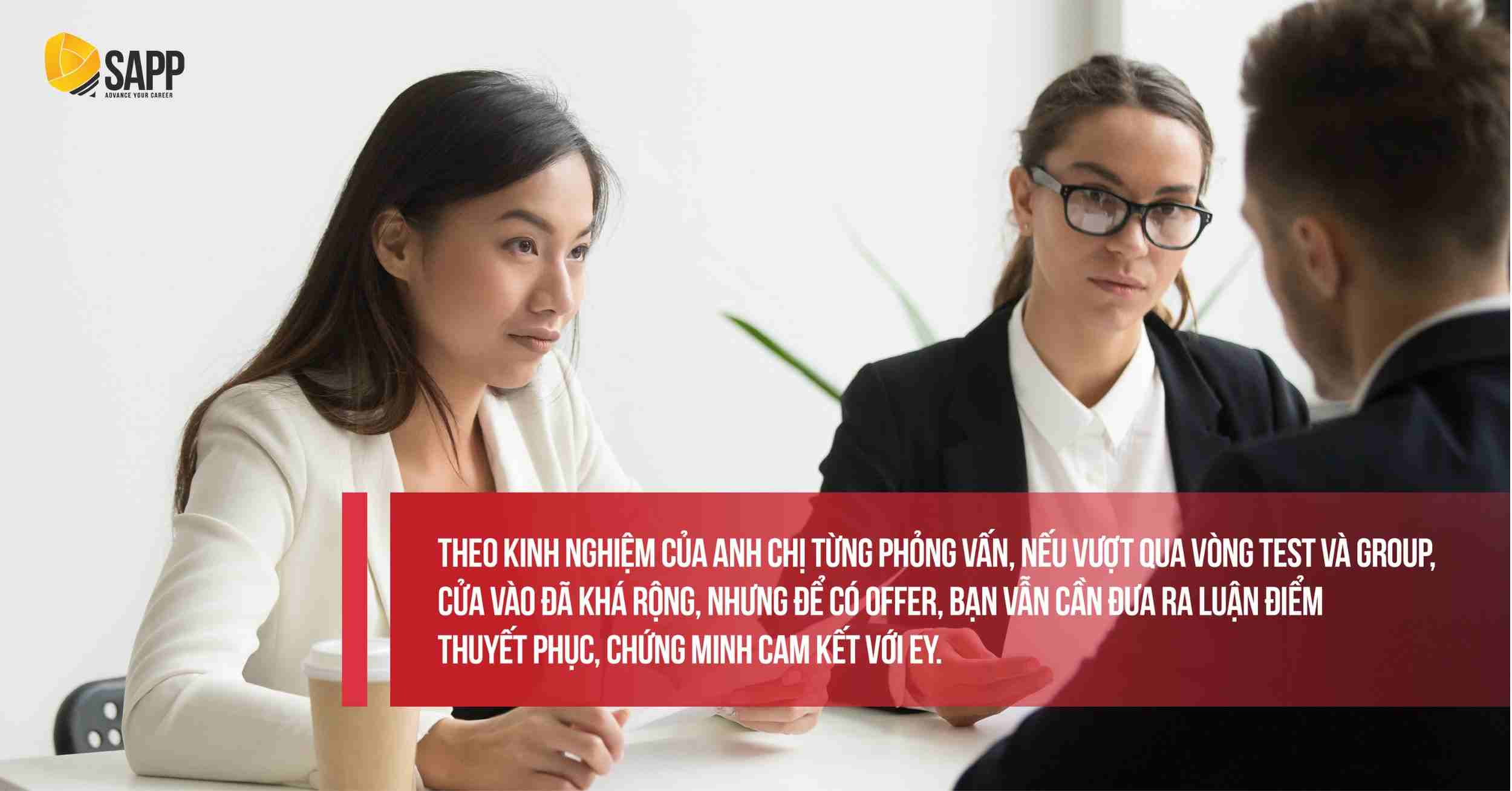 Theo kinh nghiệm của anh chị từng phỏng vấn, nếu vượt qua vòng test và group, cửa vào đã khá rộng, nhưng để có offer, bạn vẫn cần đưa ra luận điểm thuyết phục, chứng minh cam kết với EY.