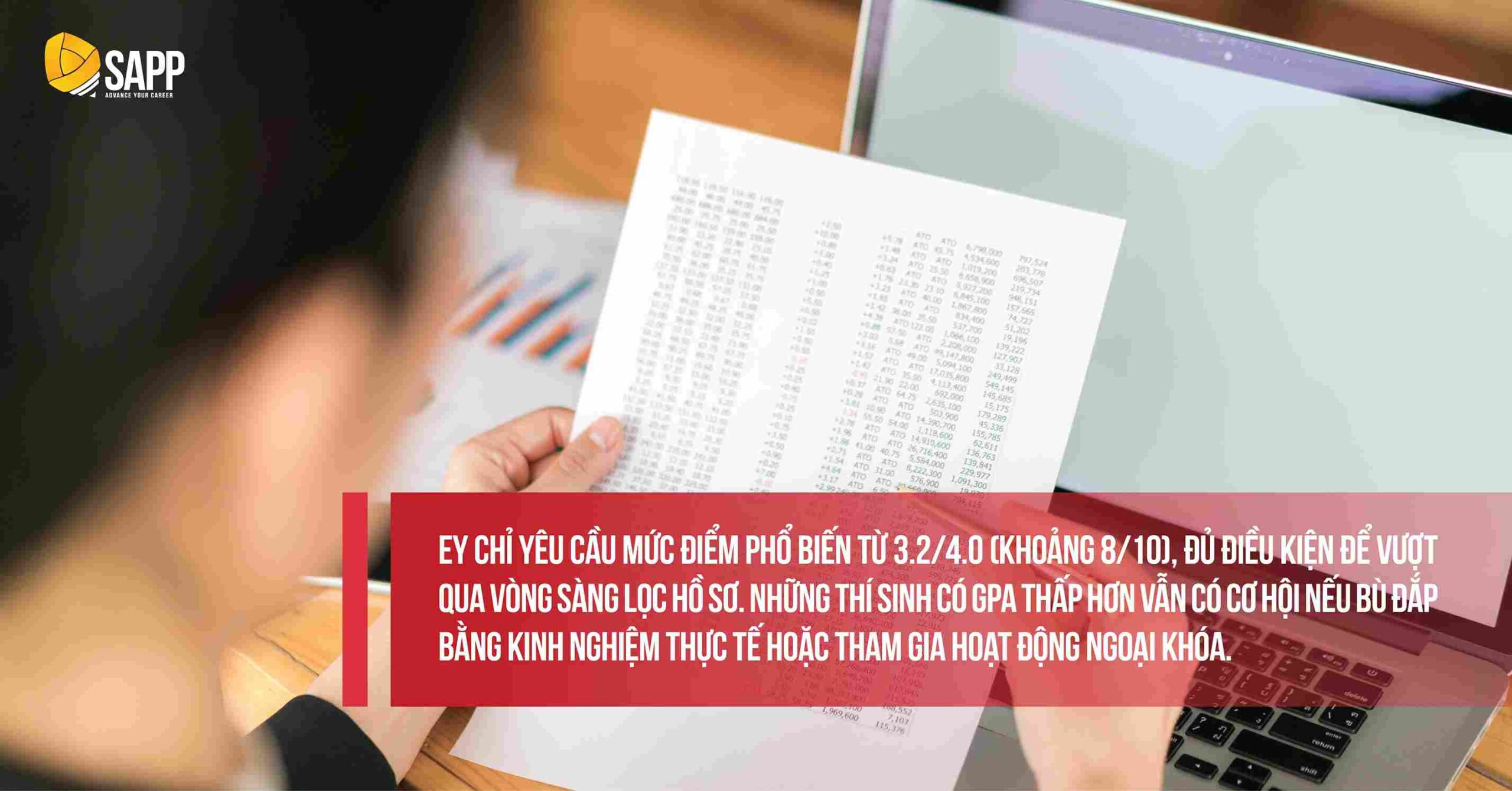 Một nhân sự làm việc lâu năm tại EY chia sẻ trên một diễn đàn Kinh tế rằng: “EY quan tâm nhiều đến cái mà bạn làm được hơn là điểm số. Trong thời gian làm việc ở đây, tôi thấy họ ưu tiên nhân sự có GPA từ 3.0 trở lên, nhưng dù điểm thấp, bạn vẫn có thể bù đắp với các hoạt động ngoại khóa và kinh nghiệm làm việc ấn tượng.”