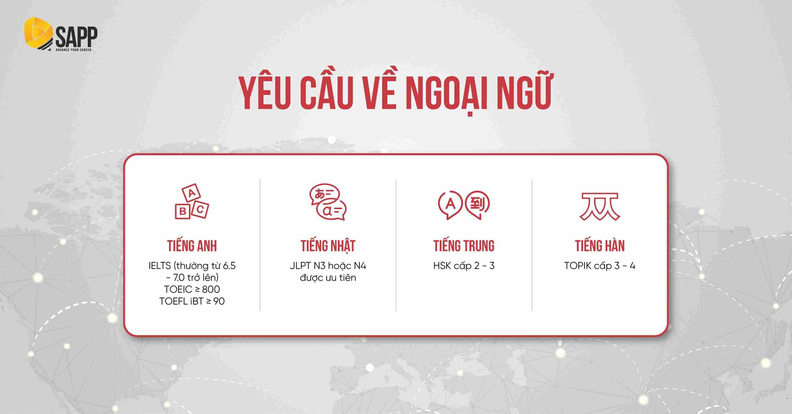 • Tiếng Anh: IELTS (thường từ 6.5–7.0 trở lên), TOEIC ≥ 800 hoặc TOEFL iBT ≥ 90.