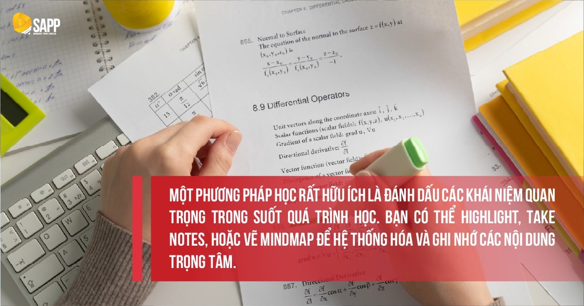 Một phương pháp học rất hữu ích là đánh dấu các khái niệm quan trọng trong suốt quá trình học. Bạn có thể highlight, take notes, hoặc vẽ mindmap để hệ thống hóa và ghi nhớ các nội dung trọng tâm. Việc này không chỉ giúp tăng khả năng ghi nhớ mà còn tạo điều kiện thuận lợi khi ôn tập lại sau này.