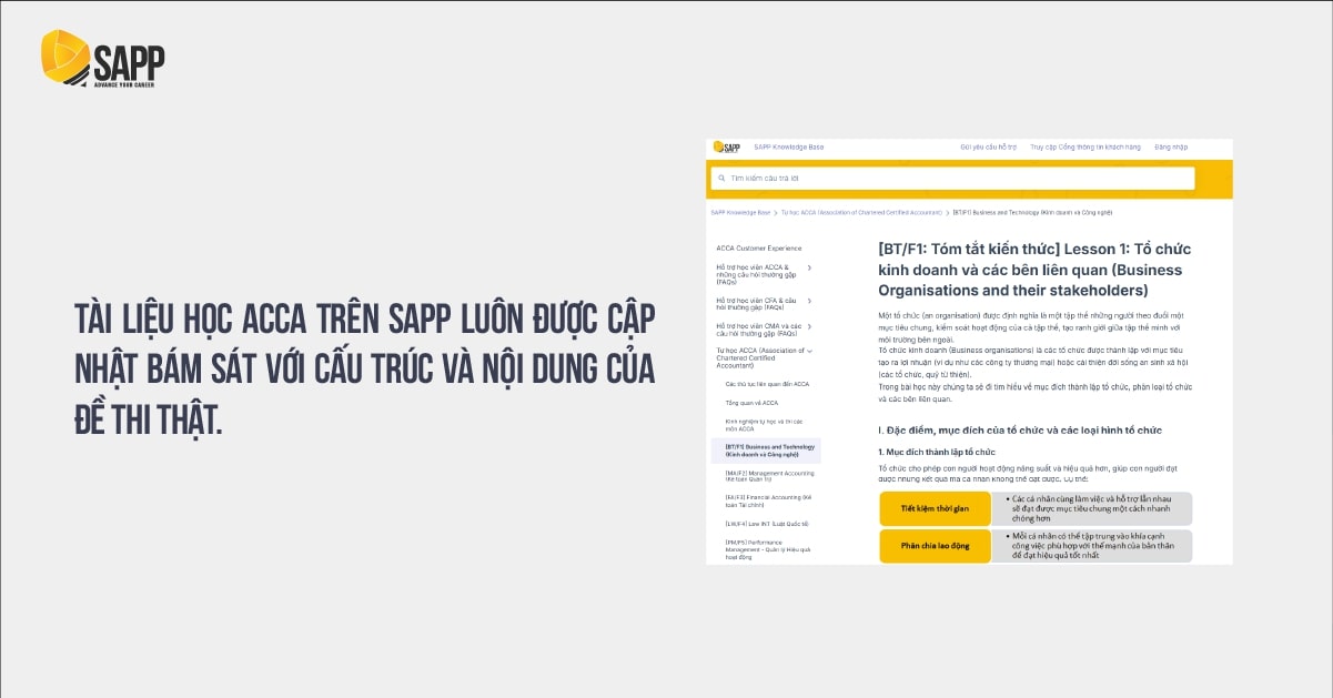 • Nội dung bám sát syllabus ACCA mới nhất: Tài liệu học ACCA trên SAPP luôn được cập nhật bám sát với cấu trúc và nội dung của đề thi thật. Điều này giúp học viên không bị học “lệch tủ”, nắm chắc các chủ đề trọng tâm mà ACCA đang chú trọng.