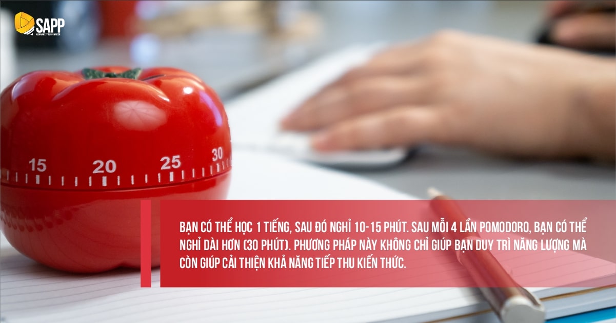 - Áp dụng phương pháp Pomodoro: Phương pháp Pomodoro là một kỹ thuật học hiệu quả giúp duy trì sự tập trung. Bạn có thể học 1 tiếng, sau đó nghỉ 10-15 phút. Sau mỗi 4 lần Pomodoro, bạn có thể nghỉ dài hơn (30 phút). Phương pháp này không chỉ giúp bạn duy trì năng lượng mà còn giúp cải thiện khả năng tiếp thu kiến thức.