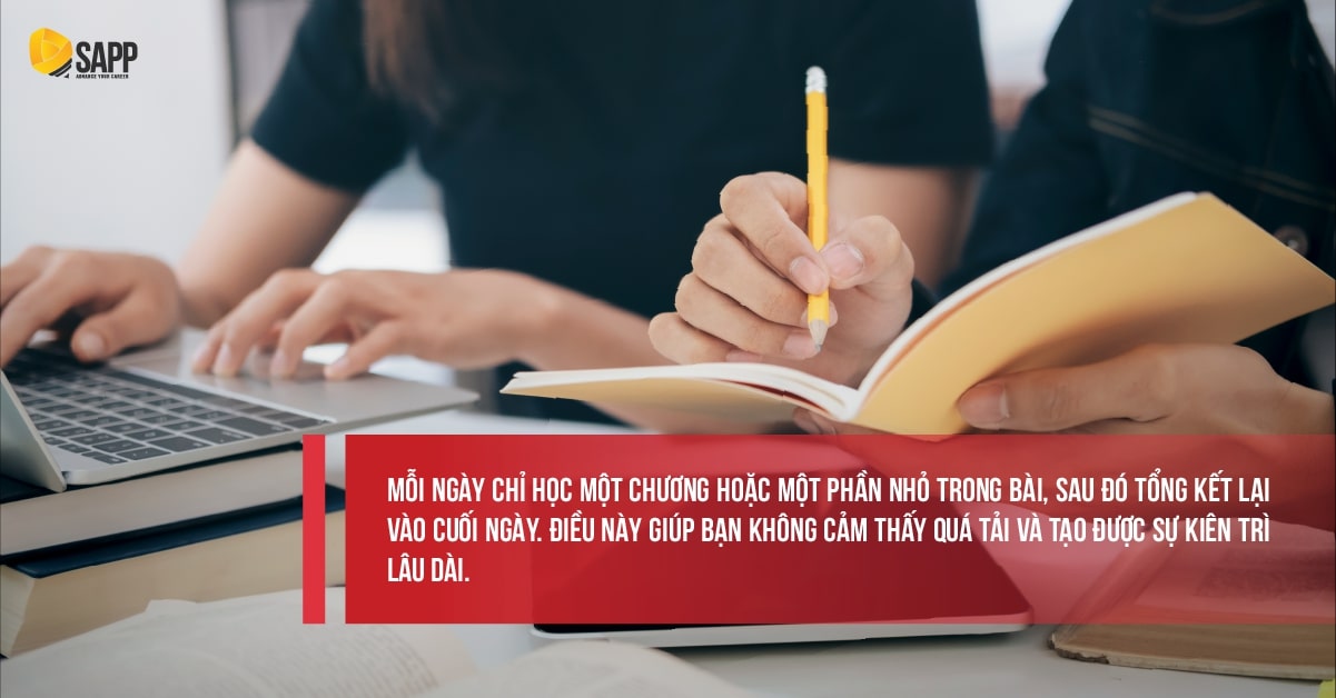 Ví dụ, mỗi ngày chỉ học một chương hoặc một phần nhỏ trong bài, sau đó tổng kết lại vào cuối ngày. Điều này giúp bạn không cảm thấy quá tải và tạo được sự kiên trì lâu dài.