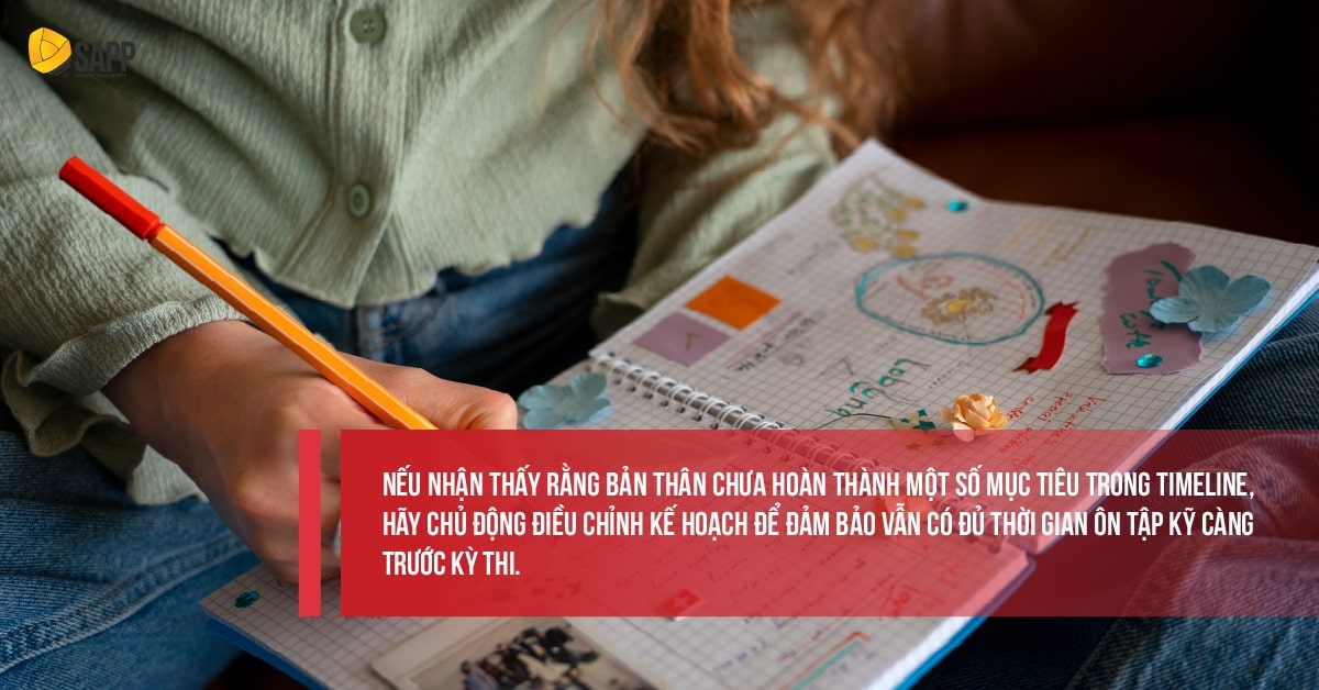 Nếu nhận thấy rằng bản thân chưa hoàn thành một số mục tiêu trong timeline, hãy chủ động điều chỉnh kế hoạch để đảm bảo vẫn có đủ thời gian ôn tập kỹ càng trước kỳ thi. Việc chỉnh sửa kế hoạch không có nghĩa là thất bại, mà chỉ đơn giản là bạn đang đảm bảo vẫn đang đi đúng hướng. Đôi khi, việc điều chỉnh có thể giúp bạn tập trung vào những phần cần cải thiện, giúp hiệu quả học tập tăng lên đáng kể.