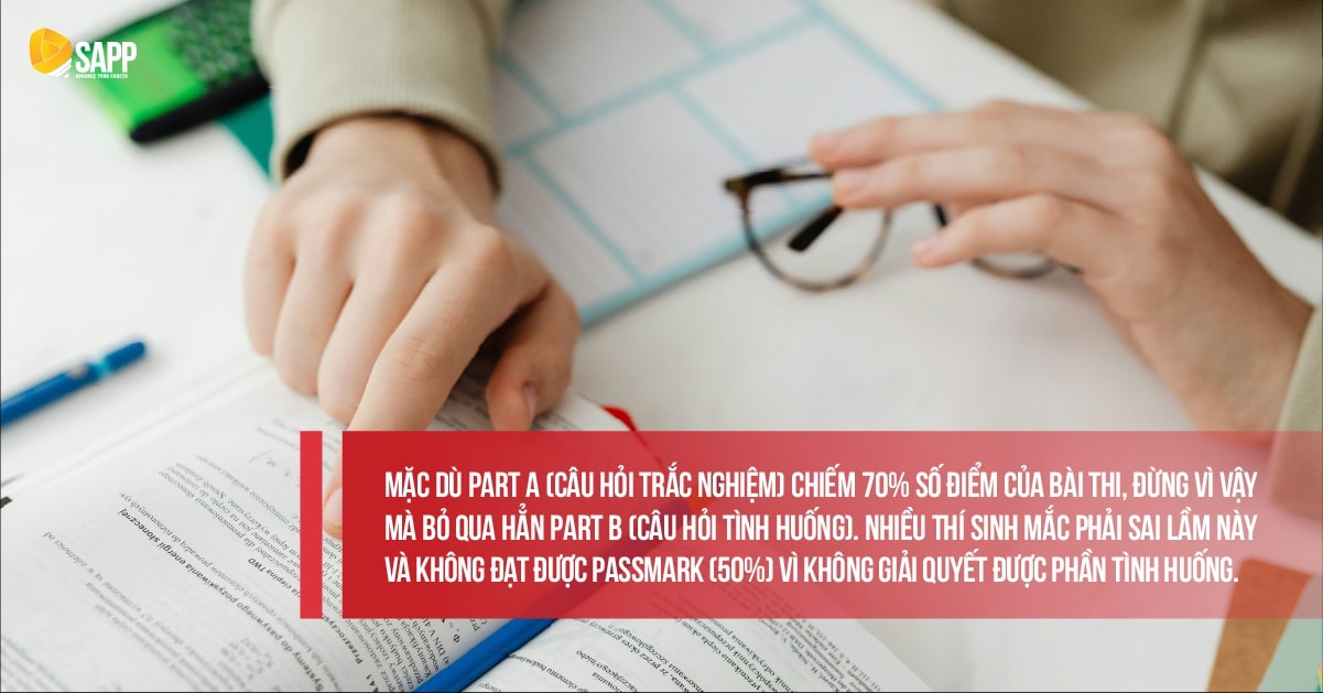 Mặc dù Part A (câu hỏi trắc nghiệm) chiếm 70% số điểm của bài thi, đừng vì vậy mà bỏ qua hẳn Part B (câu hỏi tình huống). Nhiều thí sinh mắc phải sai lầm này và không đạt được passmark (50%) vì không giải quyết được phần tình huống. Thực tế, những câu hỏi tình huống này cung cấp sẵn thông tin trong bài, bạn có thể tìm và suy luận từ thông tin đó để trả lời. Vì vậy, hãy dành thời gian làm cẩn thận 2 câu hỏi tình huống này, đừng để chúng bị bỏ qua.
