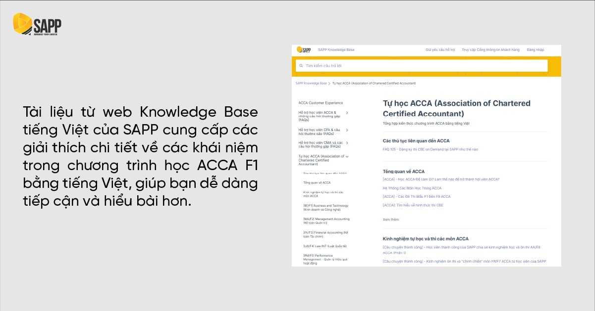 Tài liệu Knowledge Base tiếng Việt của SAPP là một lựa chọn tuyệt vời, đặc biệt đối với những bạn không hoàn toàn tự tin với tiếng Anh. Tài liệu này cung cấp các giải thích chi tiết về các khái niệm trong chương trình học ACCA F1 bằng tiếng Việt, giúp bạn dễ dàng tiếp cận và hiểu bài hơn.
