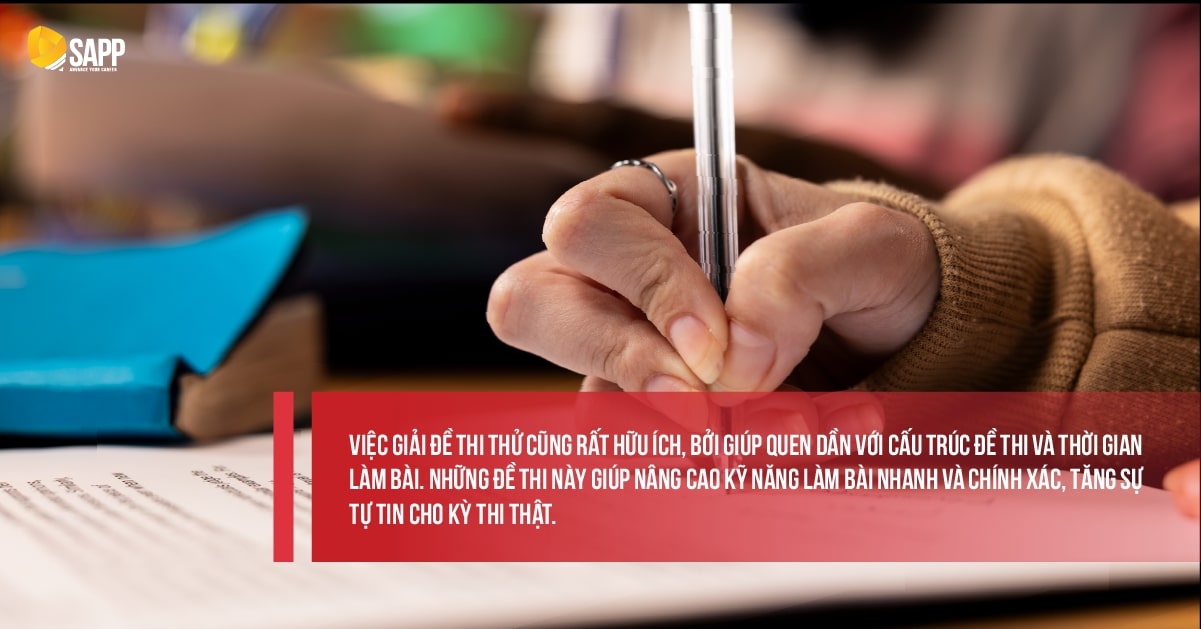 Việc giải đề thi thử cũng rất hữu ích, bởi giúp quen dần với cấu trúc đề thi và thời gian làm bài. Những đề thi này giúp nâng cao kỹ năng làm bài nhanh và chính xác, tăng sự tự tin cho kỳ thi thật.