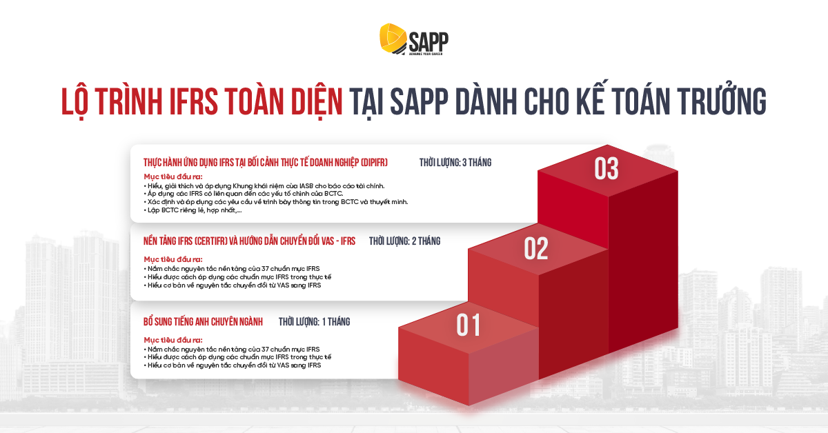 Để khẳng định vị người dẫn đầu bộ phận kế toán tại doanh nghiệp, kế toán trưởng cần nhanh chóng cập nhật chuẩn mực IFRS trong 2025. Với lộ trình IFRS toàn diện – thực chiến tại SAPP, đảm bảo giúp kế toán trưởng thành công chinh phục bộ đôi chứng chỉ CertIFR & DipIFR ngay khi kết thúc khóa học. Lộ trình học IFRS tại SAPP bao gồm 3 giai đoạn: