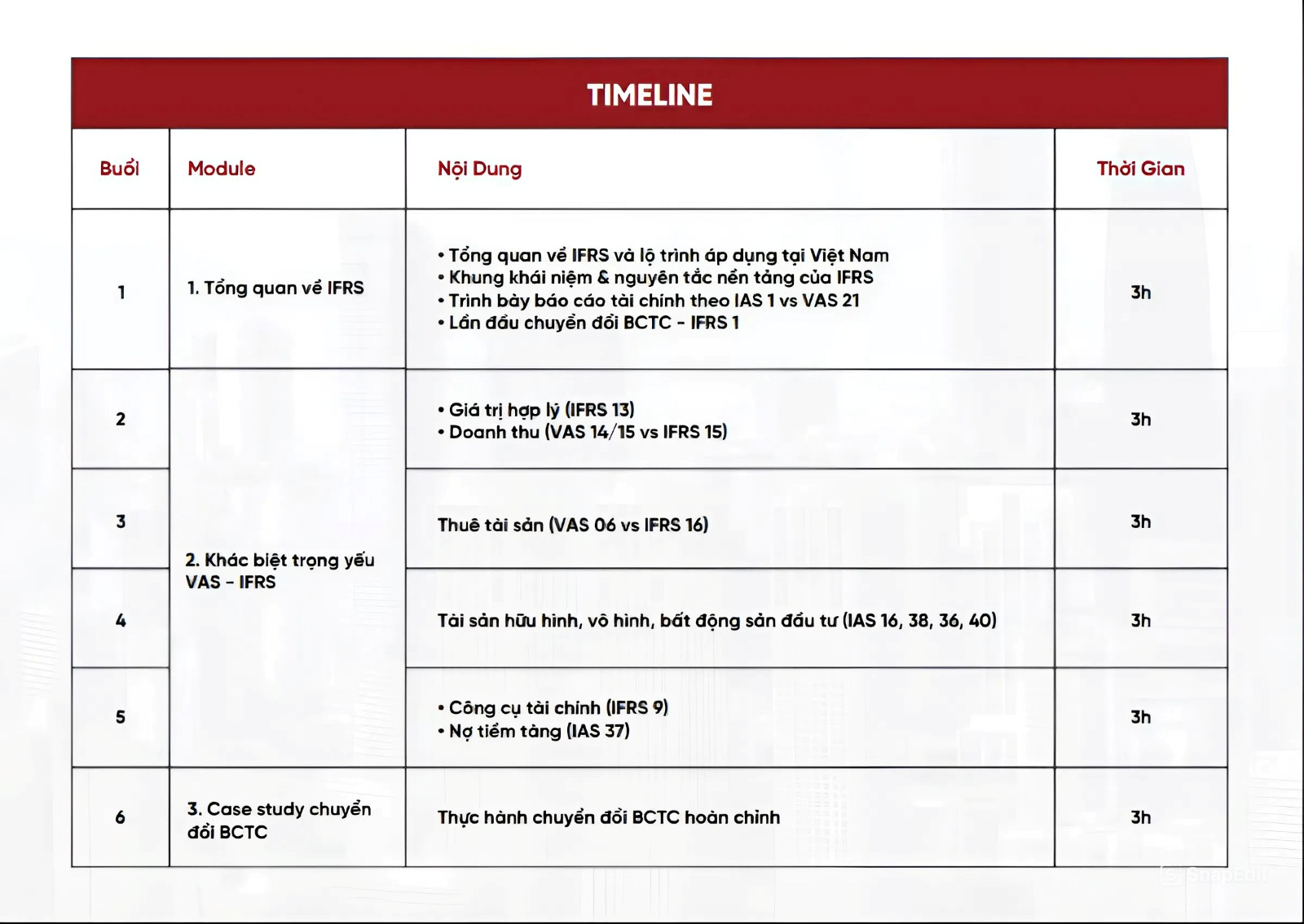 - Module 1: Tổng quan về IFRS, giúp học viên củng cố kiến thức IFRS nền tảng;