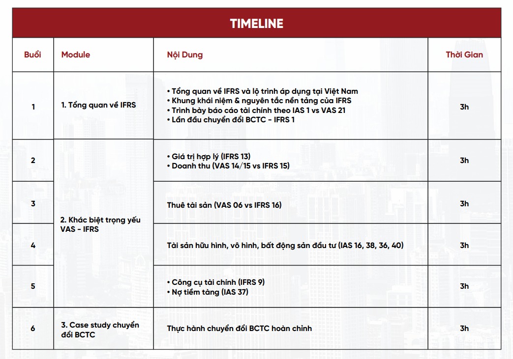 - Module 1: Tổng quan về IFRS, giúp học viên củng cố kiến thức IFRS nền tảng;