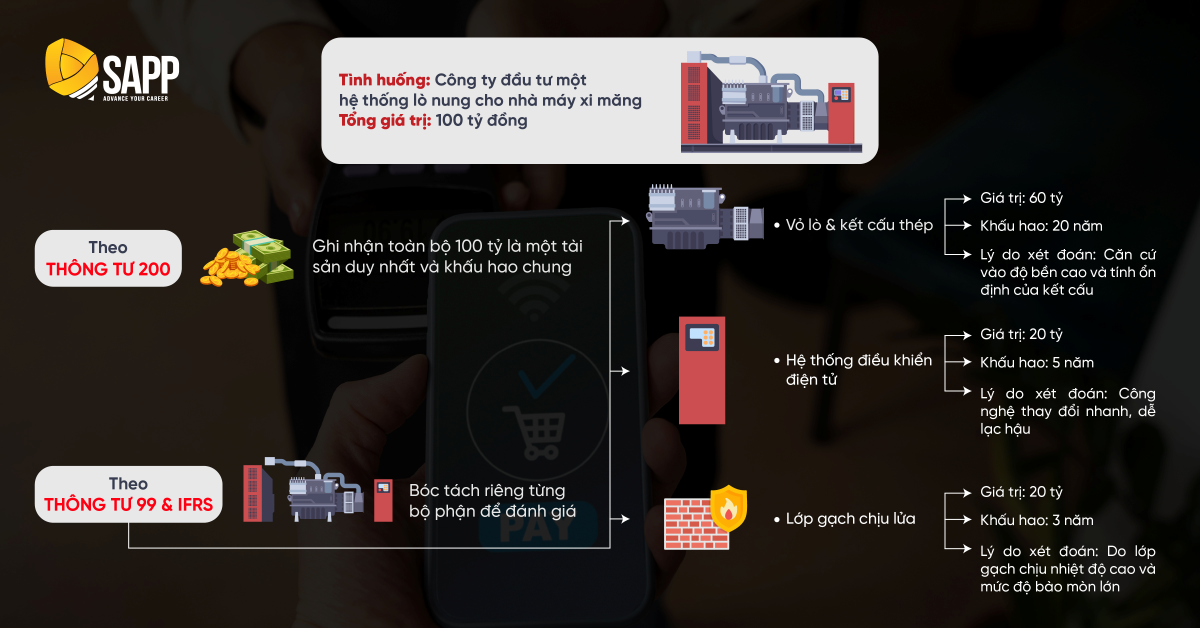 Theo VAS, toàn bộ hệ thống lò nung thường được ghi nhận là một tài sản cố định duy nhất và khấu hao chung theo một thời gian sử dụng xác định. Trong khi đó, theo IFRS, tài sản cần được tách thành các cấu phần riêng biệt do mỗi bộ phận có thời gian sử dụng và mức tiêu hao lợi ích kinh tế khác nhau.