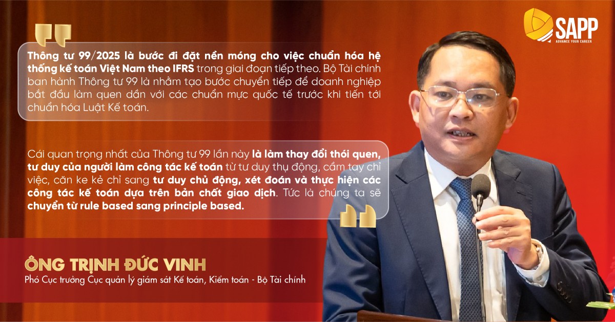 Trong khuôn khổ Hội thảo IFRS Pathway Summit diễn ra ngày 05/12/2025 do SAPP Edu tổ chức, ông Trịnh Đức Vinh – Phó Cục trưởng Cục Quản lý, Giám sát Kế toán, Kiểm toán (Bộ Tài chính) đã chia sẻ về vai trò của Thông tư 99/2025/TT-BTC như sau: