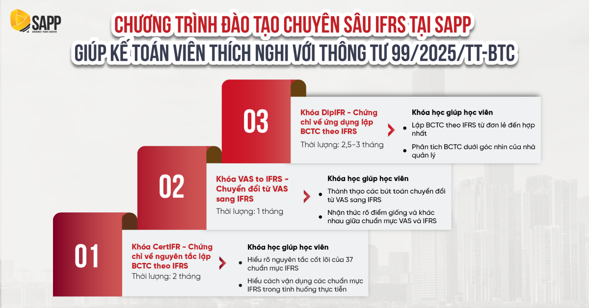 Thông tư 99/2025/TT-BTC phản ánh rõ tinh thần của IFRS với định hướng tiếp cận theo bản chất và xét đoán nghề nghiệp, thay vì áp dụng máy móc theo quy định. Vì vậy, để đáp ứng yêu cầu chuyên môn trong bối cảnh mới, nhân sự kế toán cần trang bị nền tảng IFRS bài bản. Chương trình đào tạo chuyên sâu IFRS tại SAPP Academy giúp kế toán viên xây dựng tư duy principle based – nền tảng “cốt lõi” giúp nhân sự sẵn sàng thích nghi với Thông tư mới tiệm cận theo chuẩn mực quốc tế.