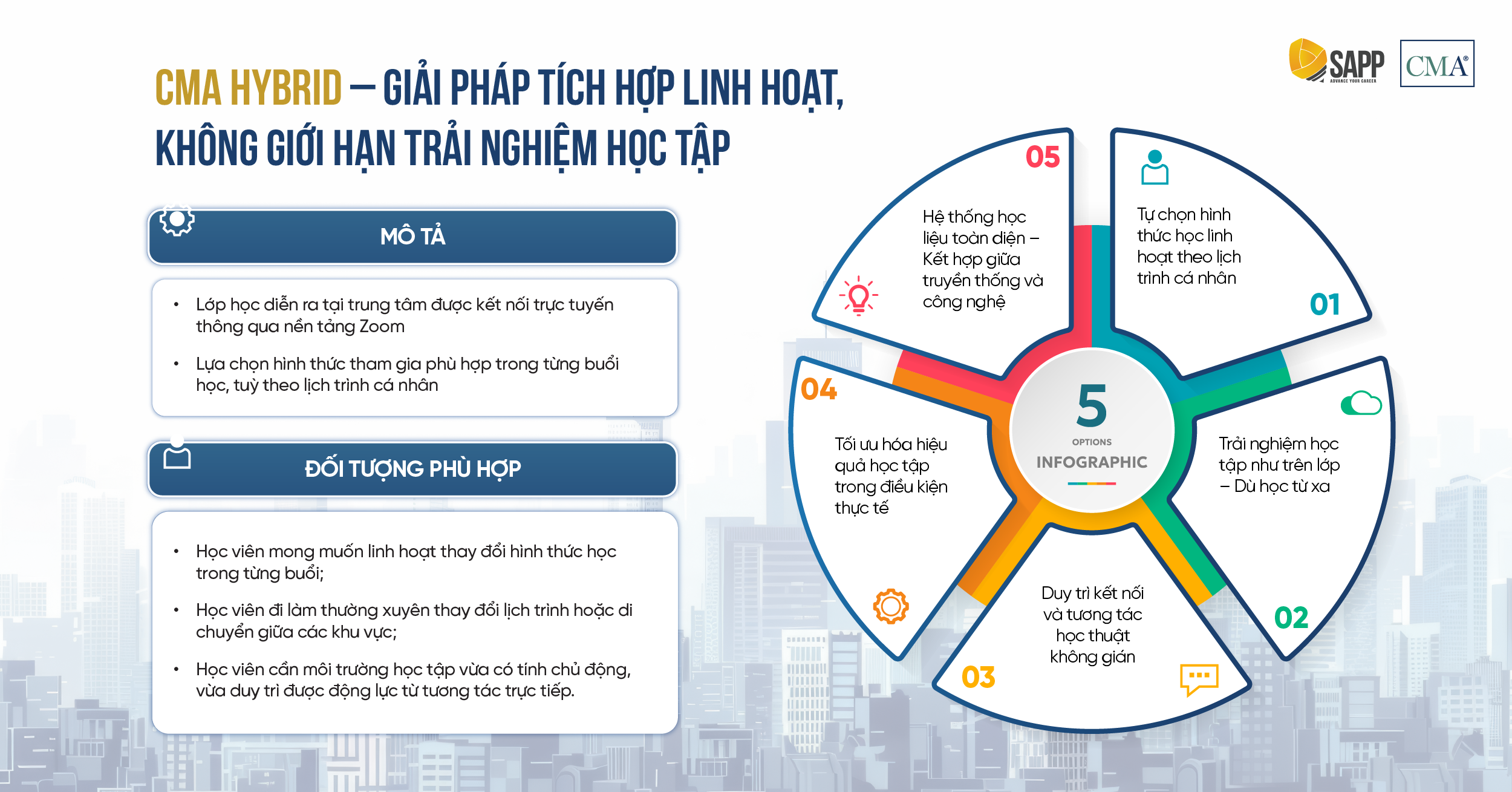 Với mô hình Hybrid, mỗi buổi học CMA tại SAPP được tổ chức song song: lớp học diễn ra tại trung tâm được kết nối trực tuyến thông qua nền tảng Zoom. Học viên có thể lựa chọn hình thức tham gia phù hợp trong từng buổi học, tuỳ theo tình huống thực tế như lịch làm việc, sức khỏe, thời tiết hoặc yếu tố đi lại.