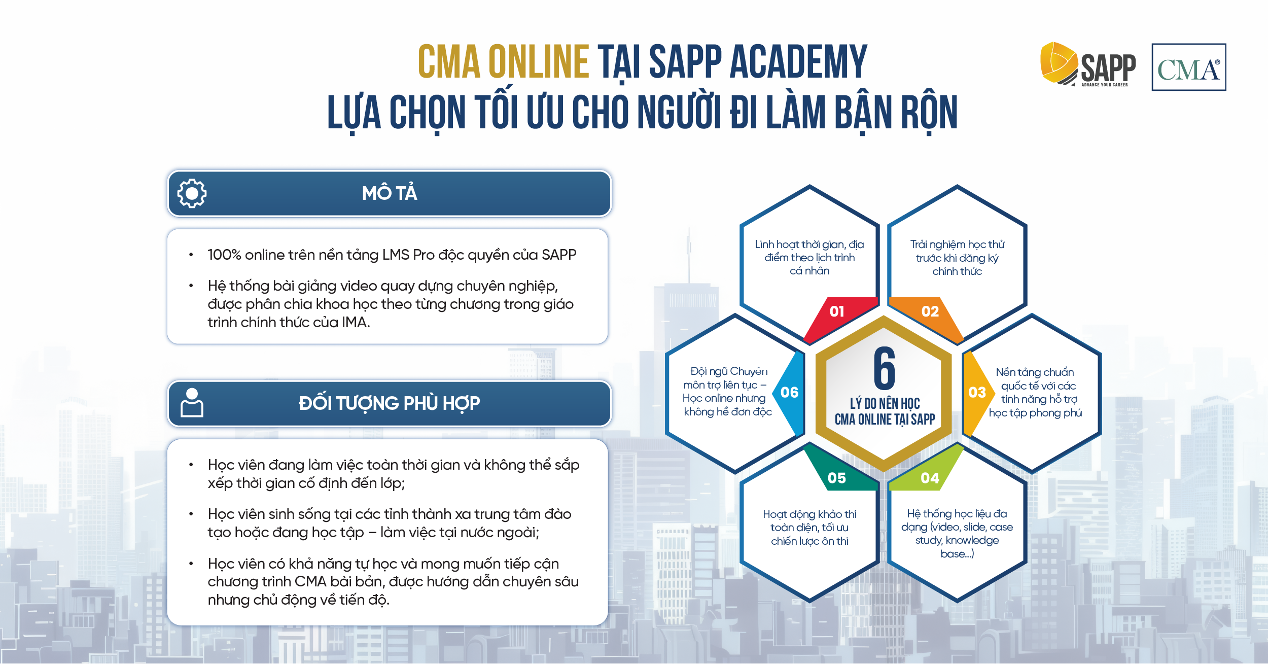 Với hệ thống học tập được thiết kế bài bản và cơ chế hỗ trợ sâu sát, CMA Online tại SAPP không chỉ là lựa chọn linh hoạt cho người bận rộn mà còn là giải pháp học tập toàn diện, giúp học viên chinh phục chứng chỉ CMA một cách hiệu quả và bền vững.