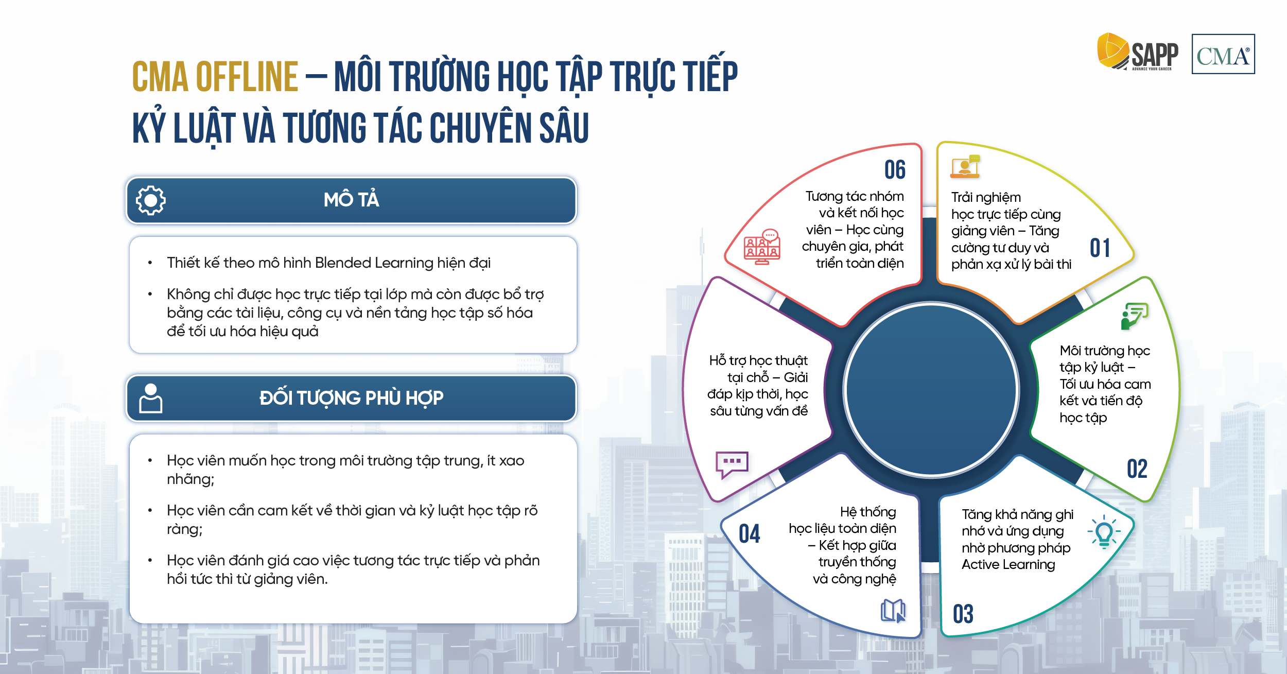 Với sự kết hợp giữa lớp học truyền thống và nền tảng số hóa hỗ trợ, CMA Offline tại SAPP không chỉ mang lại trải nghiệm học tập chuyên sâu mà còn tạo môi trường thúc đẩy kỷ luật và hiệu quả thực chất.