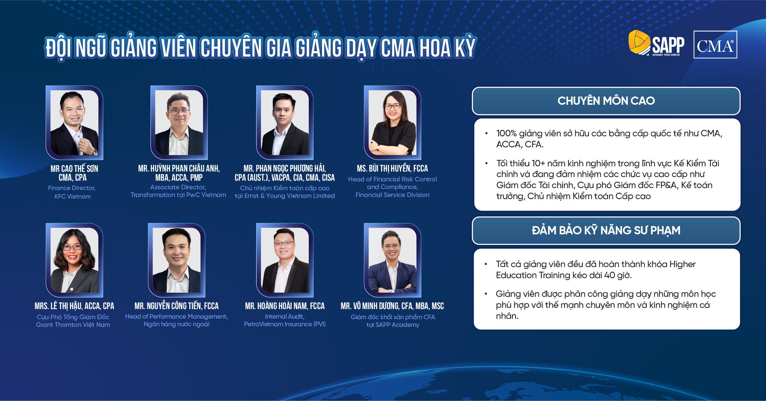 Đội ngũ giảng viên tại SAPP 100% sở hữu chứng chỉ quốc tế, hiện đang đảm nhiệm các vị trí như CFO, Finance Director, Cựu Giám đốc M&A,… với hơn 10 năm kinh nghiệm thực tiễn, am hiểu sâu sắc cả nội dung kỳ thi và ứng dụng thực tế. Học viên được hướng dẫn cách tư duy, cách giải quyết tình huống và quản lý thời gian làm bài – những yếu tố giúp tăng xác suất đỗ ngay lần thi đầu tiên.