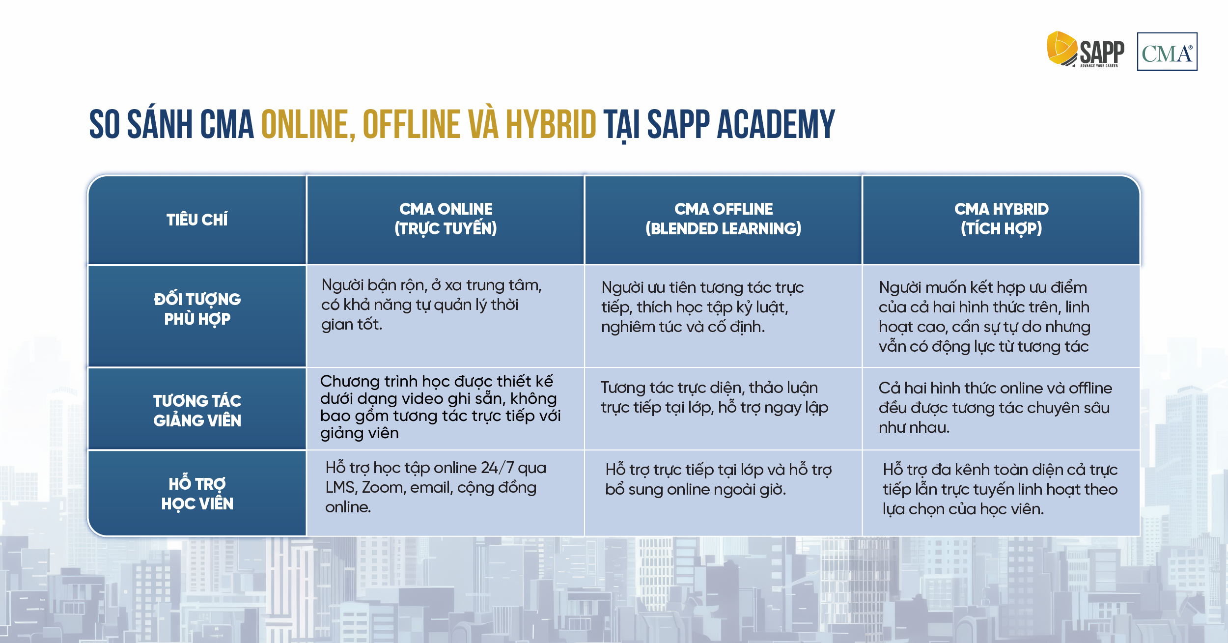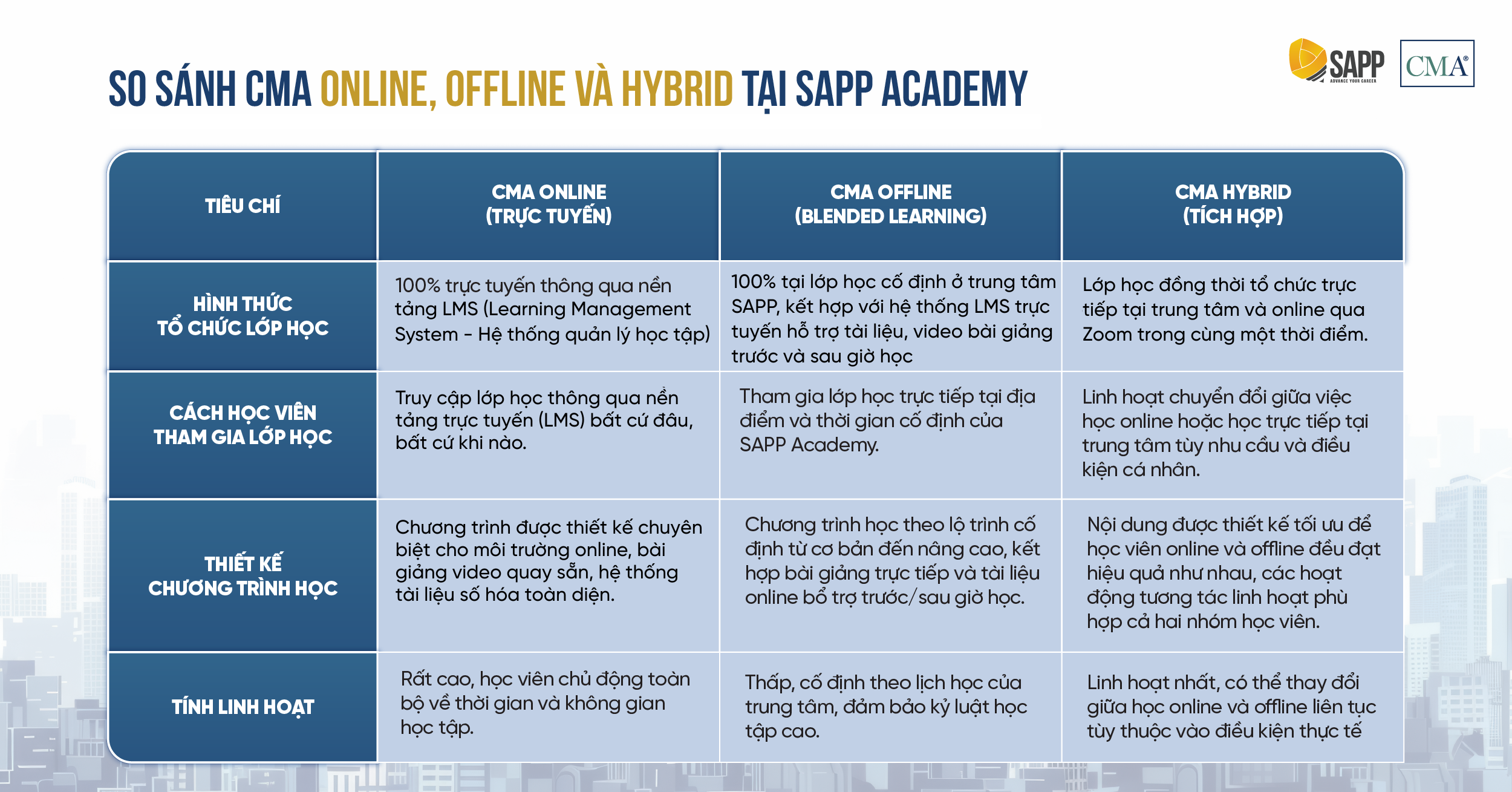 So sánh chi tiết ba hình thức học CMA tại SAPP Academy: Online – Offline – Hybrid