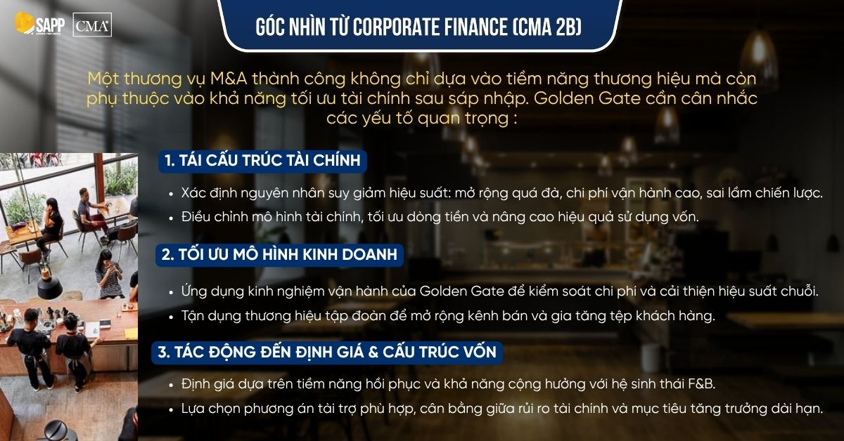 Một thương vụ M&A thành công không chỉ dựa vào tiềm năng thương hiệu mà còn phụ thuộc vào khả năng tối ưu tài chính sau sáp nhập. Golden Gate cần cân nhắc các yếu tố quan trọng sau: