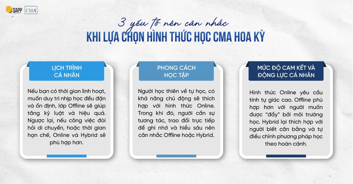 Tìm hiểu chi tiết về ba hình thức học CMA Online, Offline và Hybrid tại đây. CMA Online, Offline hay Hybrid: Hình thức nào phù hợp với bạn?