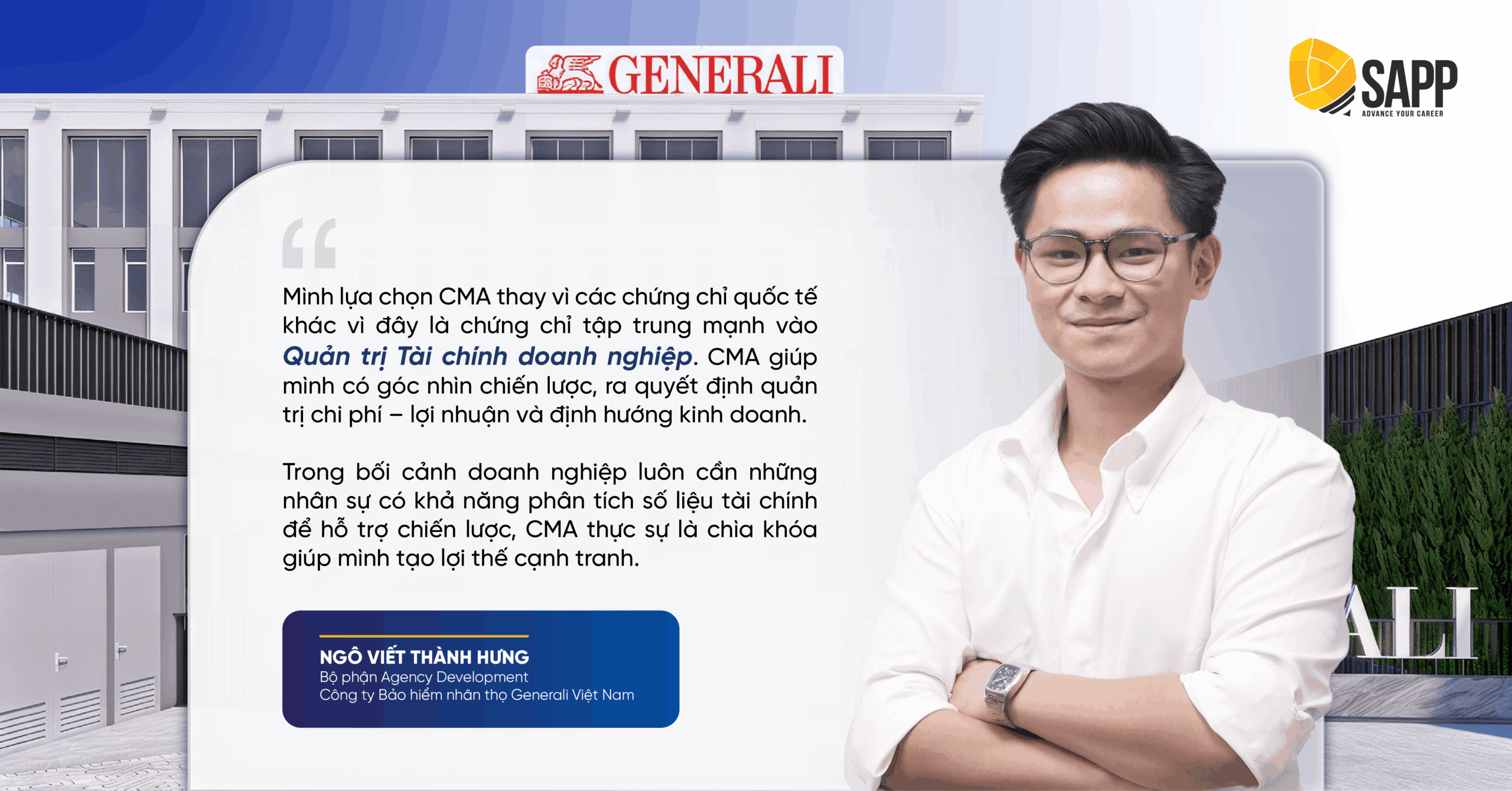 Ngô Viết Thành Hưng, cựu sinh viên ngành Tài chính Doanh nghiệp, Trường Đại học Kinh tế Quốc dân là một ví dụ tiêu biểu. Chỉ vừa tốt nghiệp và bước vào môi trường làm việc tại Generali Việt Nam, Hưng đã xuất sắc đạt 440 điểm CMA Part 2 ngay lần thi đầu tiên. Câu chuyện của Hưng cho thấy cách một người trẻ có thể chủ động trang bị “chìa khóa cạnh tranh” cho mình bằng CMA, từ đó tự tin bước vào thị trường lao động toàn cầu.