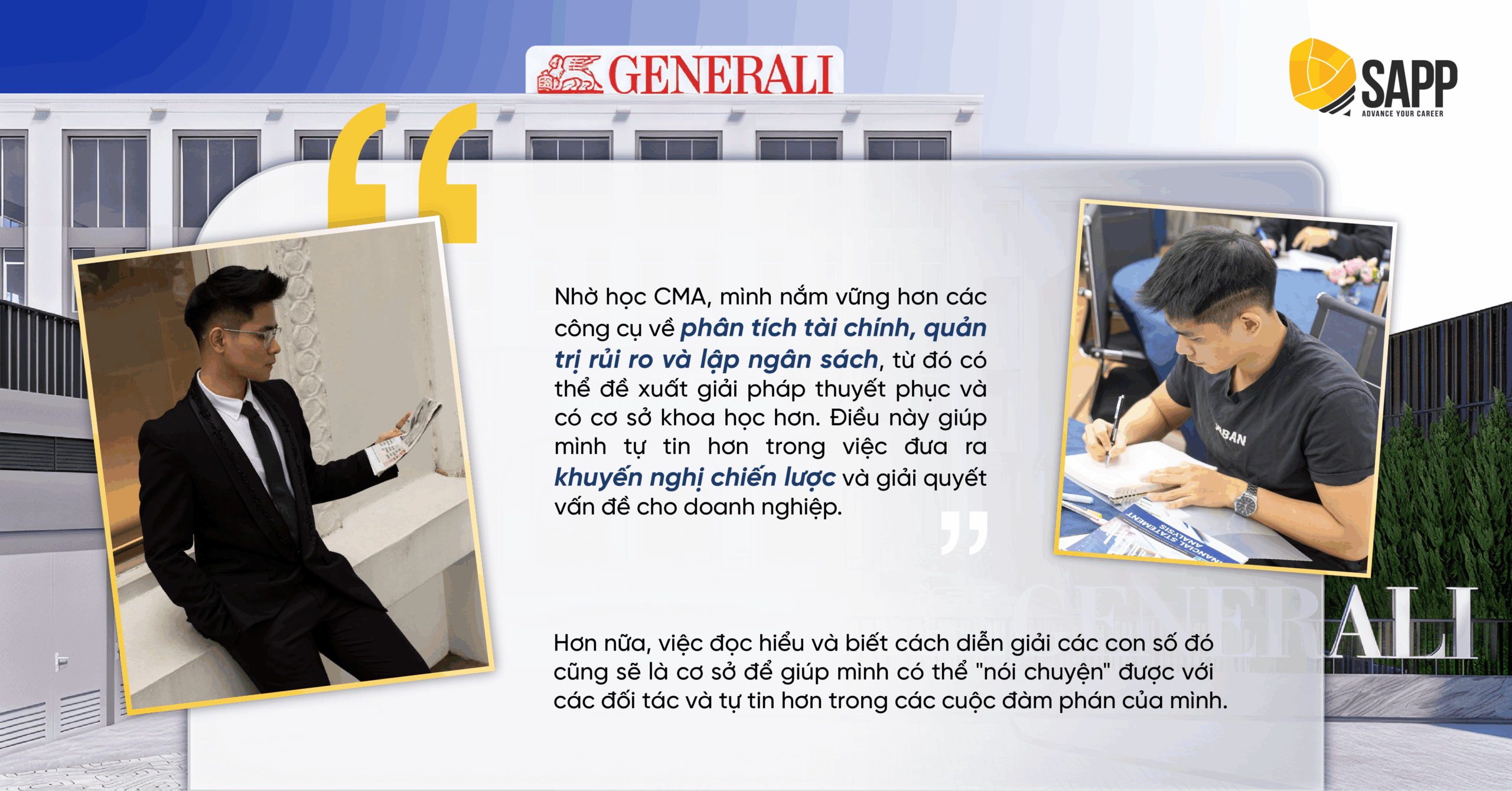 Khi quyết định theo đuổi CMA – một chứng chỉ quốc tế còn khá mới tại Việt Nam, Hưng đặt ra tiêu chí lựa chọn một trung tâm có uy tín và đủ kinh nghiệm để đồng hành lâu dài. Với thương hiệu đã được khẳng định và những thành tích nổi bật trong đào tạo, SAPP trở thành lựa chọn hàng đầu mà Hưng tin tưởng để bắt đầu hành trình chinh phục CMA.