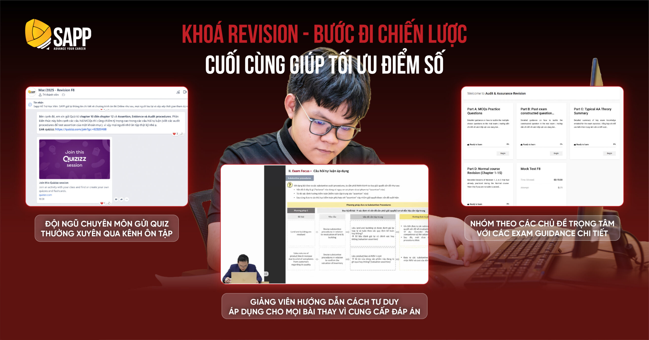 Bên cạnh slide bài giảng, nền tảng còn cung cấp revision và các tài liệu bổ trợ quan trọng từ ACCA. Lương Mạnh Đức chia sẻ: “Tài liệu và giáo trình của SAPP rất cô đọng, bám sát chương trình ACCA, giúp em tiết kiệm đáng kể thời gian chọn lọc thông tin.”