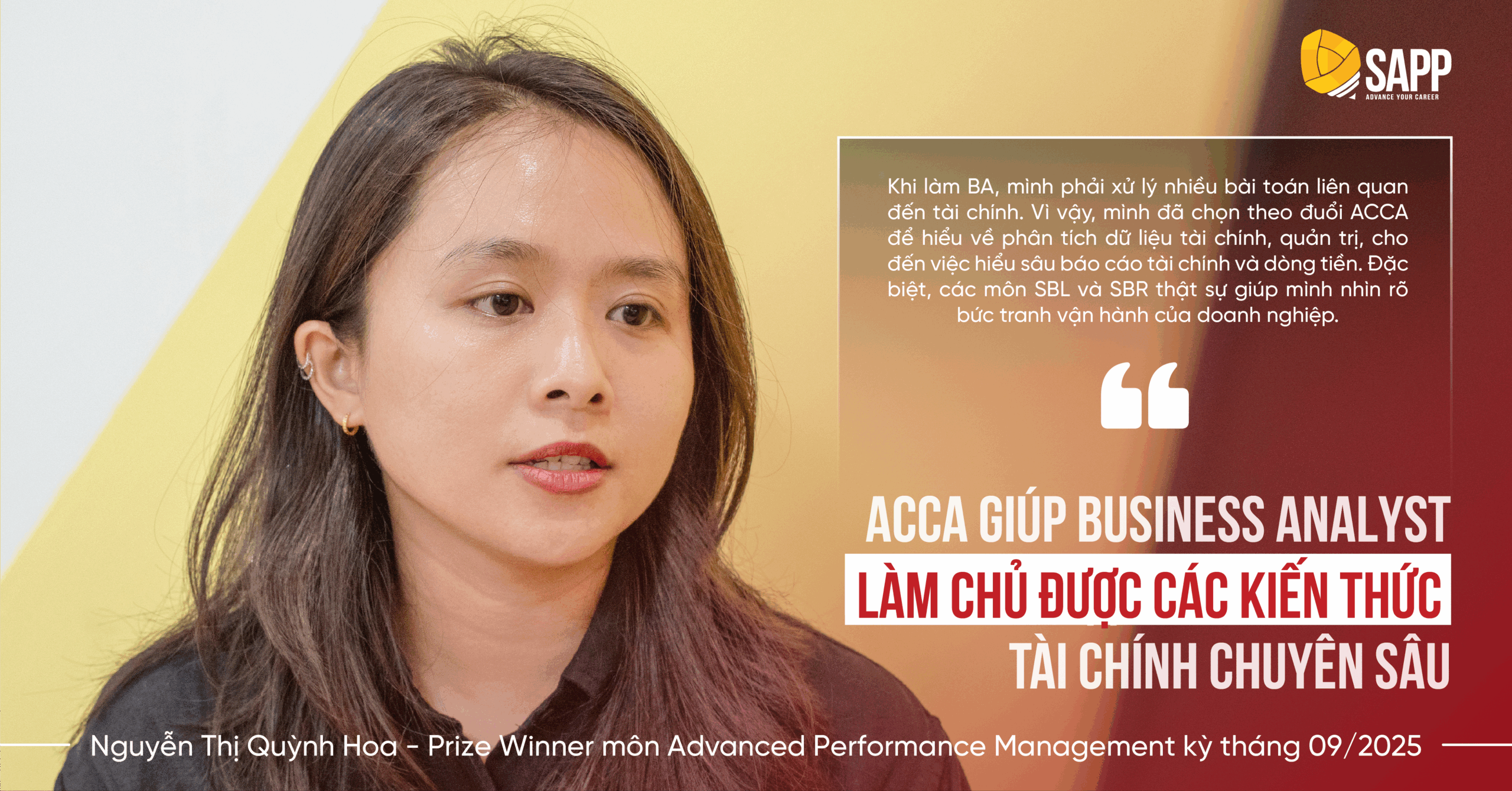 Chia sẻ về hành trình học ACCA, Quỳnh Hoa cho biết phương pháp hiệu quả nhất chính là “vừa học vừa áp dụng” vào công việc hiện tại. Với vai trò Business Analyst, kiến thức môn APM đặc biệt hữu ích khi giúp bạn hiểu được cách xây dựng KPI phù hợp, phân tích hiệu quả hoạt động để nhận diện điểm nghẽn trong quy trình và hiểu rõ góc nhìn chiến lược đằng sau các quyết định của ban lãnh đạo. Nhờ liên tục đối chiếu bài học APM với các tình huống thực tế tại công ty, bạn Hoa đã hiểu sâu được tư duy của môn học và xuất sắc trở thành Thủ khoa Việt Nam.
