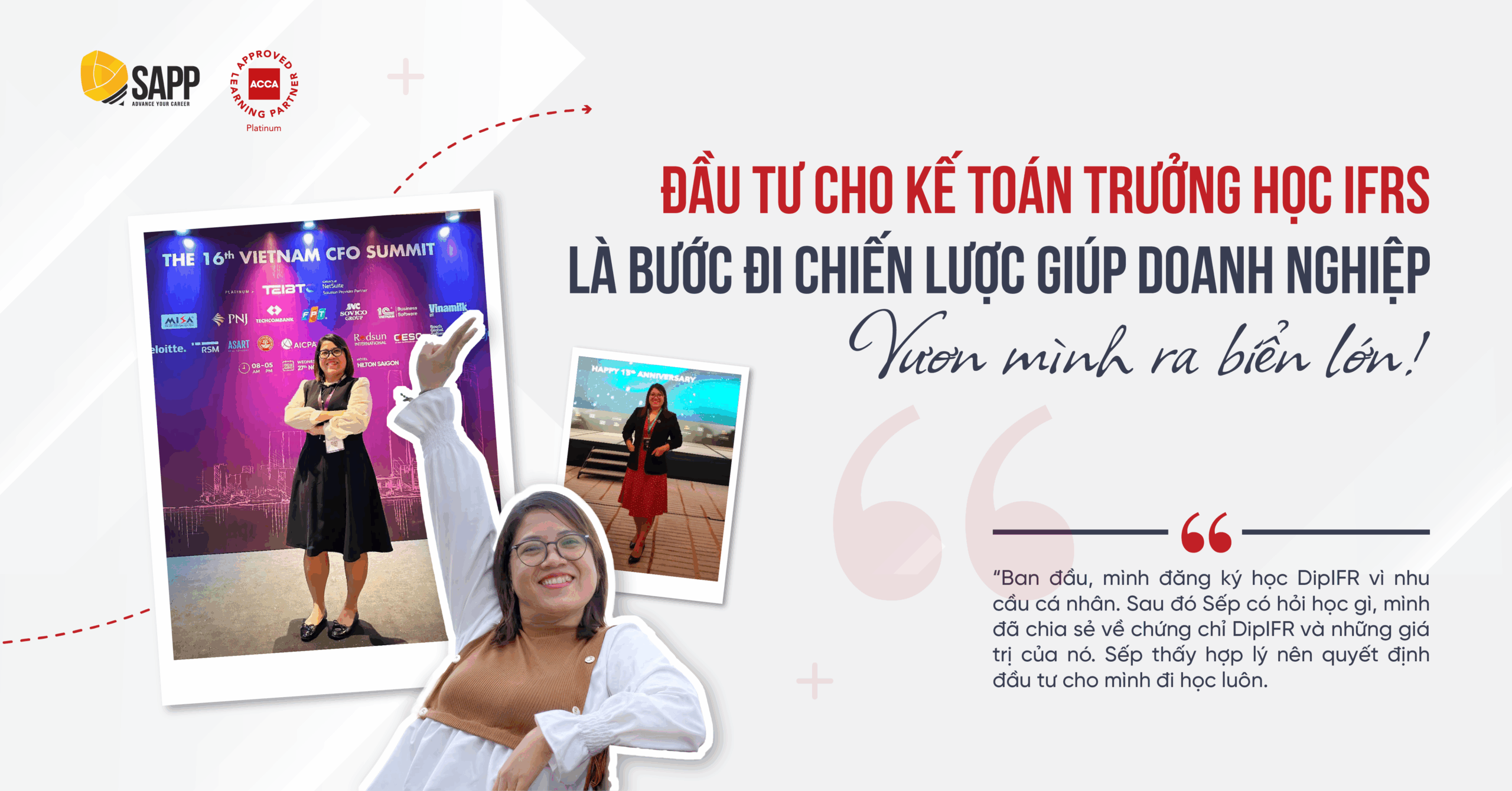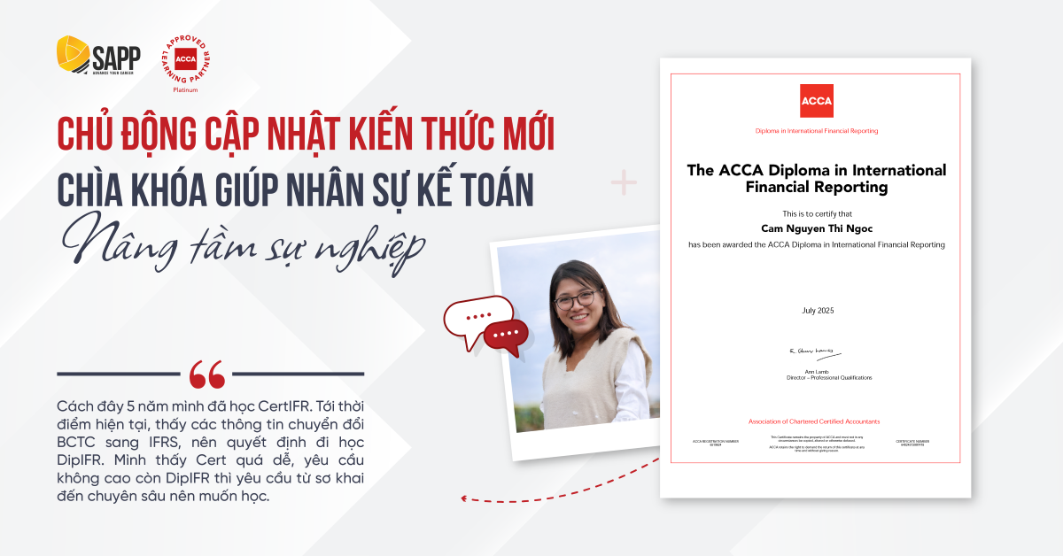 “Ban đầu, mình đăng ký học DipIFR vì nhu cầu cá nhân. Sau đó Sếp có hỏi học gì, mình đã chia sẻ về chứng chỉ DipIFR và những giá trị của nó. Sếp thấy hợp lý nên quyết định đầu tư cho mình đi học luôn.” Đây là những lời chia sẻ chân thành của chị Ngọc Cầm – hiện đang là Kế toán trưởng tại một doanh nghiệp ở TP Hồ Chí Minh. Đồng thời chị cũng là học viên xuất sắc chinh phục DipIFR tháng 6/2025 của SAPP Academy. Với tài năng và tinh thần cầu tiến, chị Cầm đã được ban lãnh đạo tin tưởng đầu tư học IFRS để ứng dụng vào doanh nghiệp trong hành trình gọi vốn FDI.