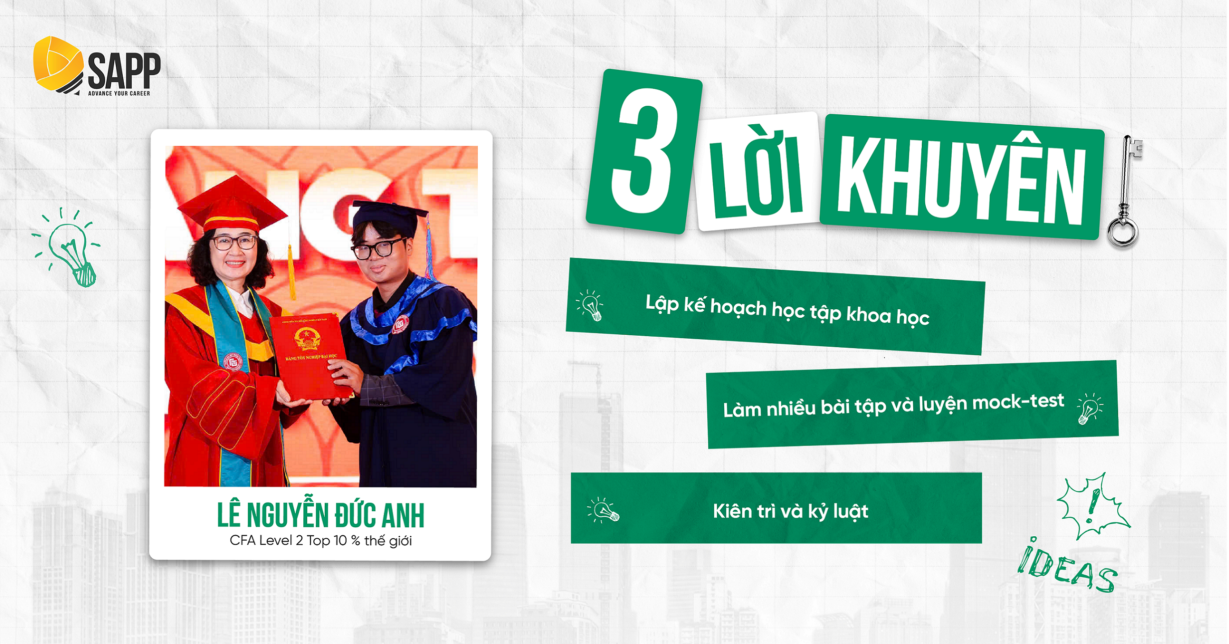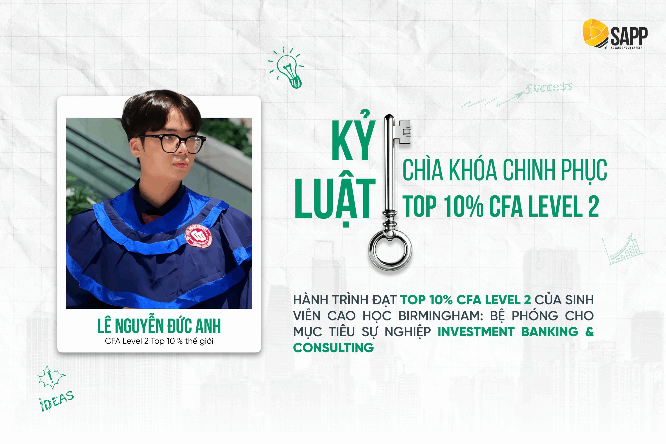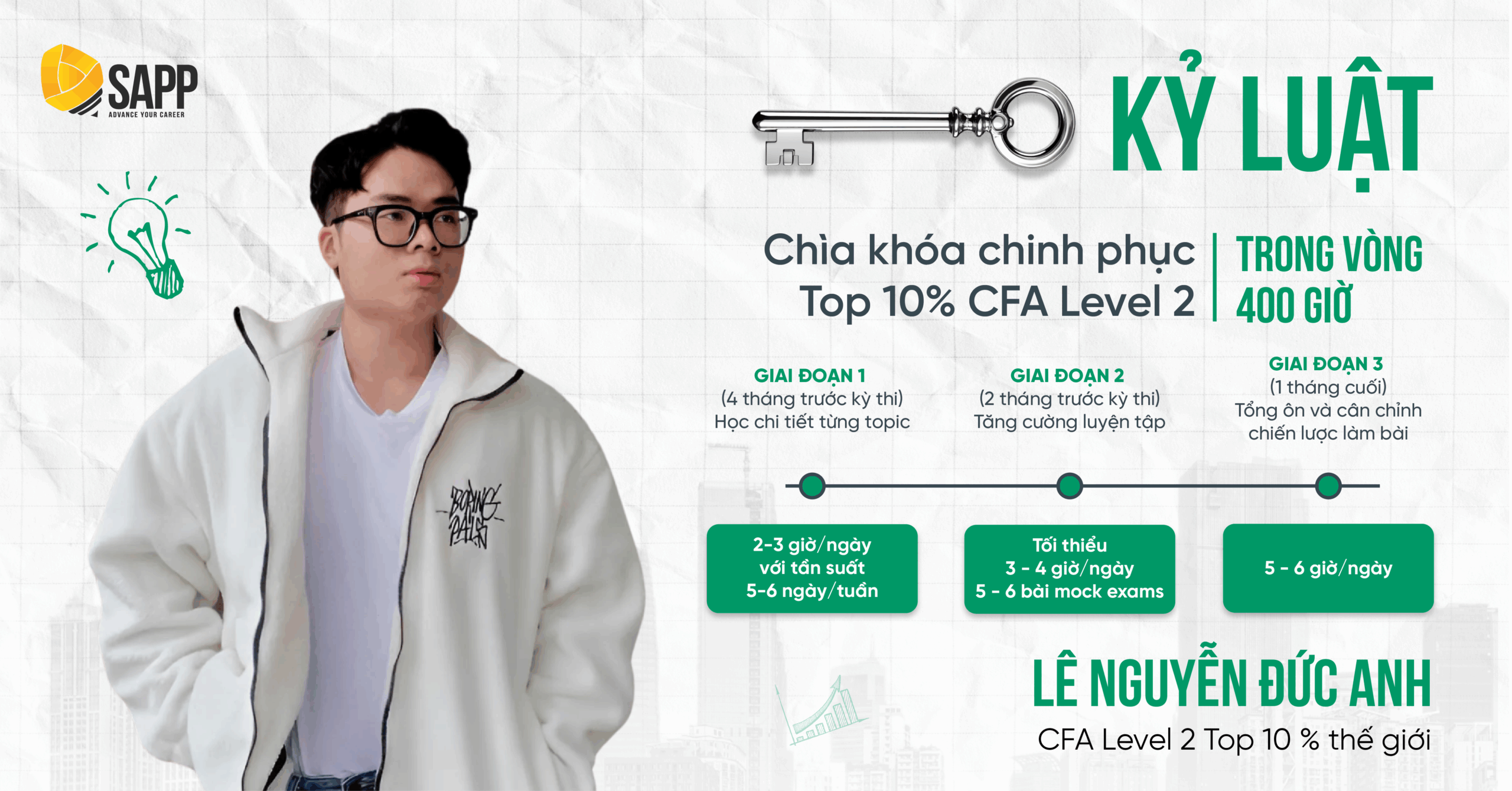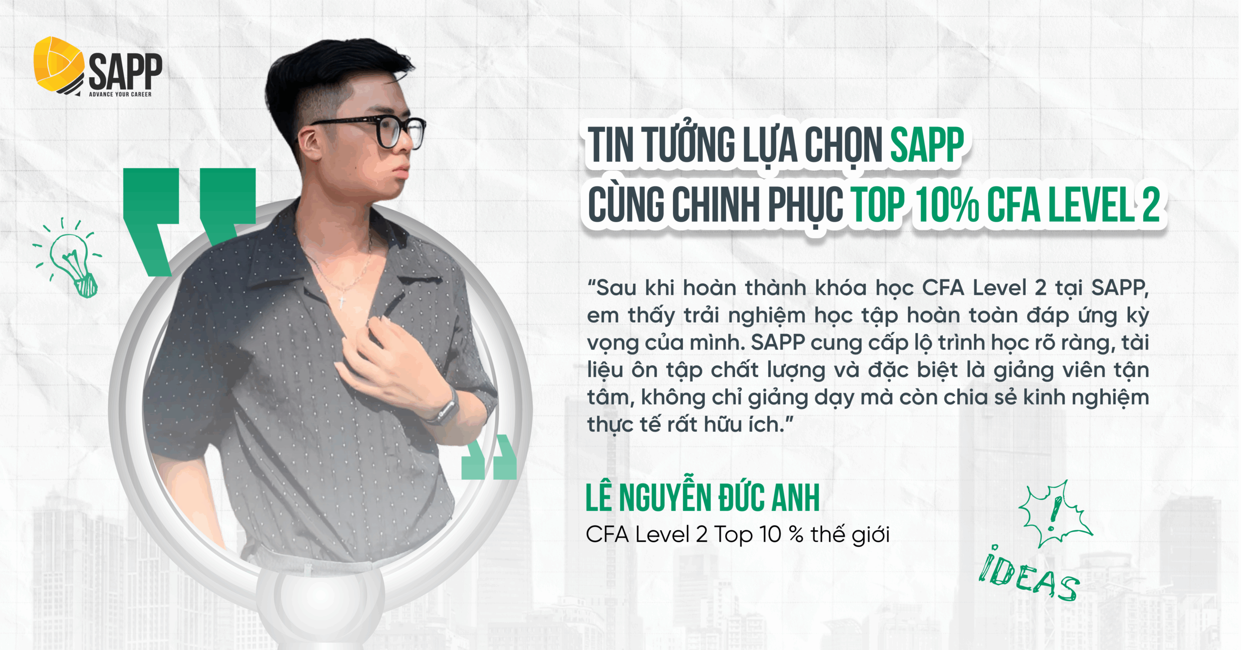 Một lần nữa, SAPP Academy chúc mừng Lê Nguyễn Đức Anh đã xuất sắc đạt kết quả Top 10% CFA Level 2 trong kỳ tháng 02/2025 vừa qua. Cảm ơn Đức Anh đã dành thời gian để chia sẻ về hành trình chinh phục CFA đáng ngưỡng mộ của mình. SAPP tin rằng, với nỗ lực không ngừng nghỉ của bạn, Đức Anh cũng sẽ đạt được mục tiêu CFA Level 3 mà bạn hướng tới.