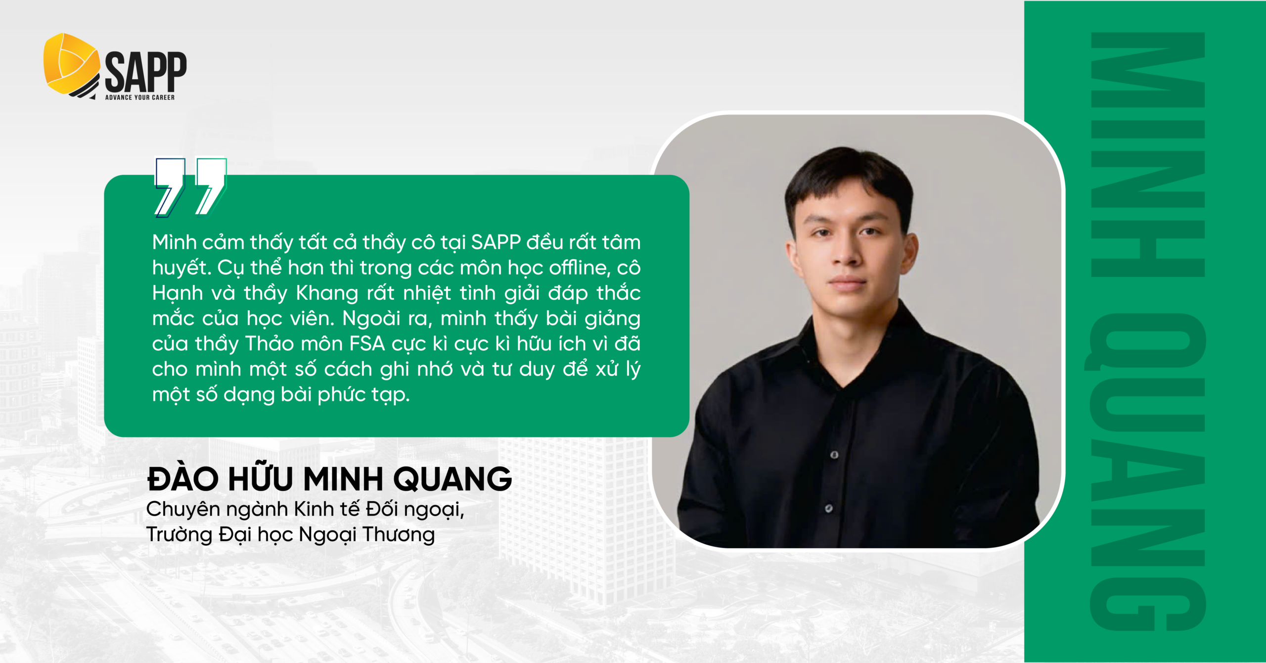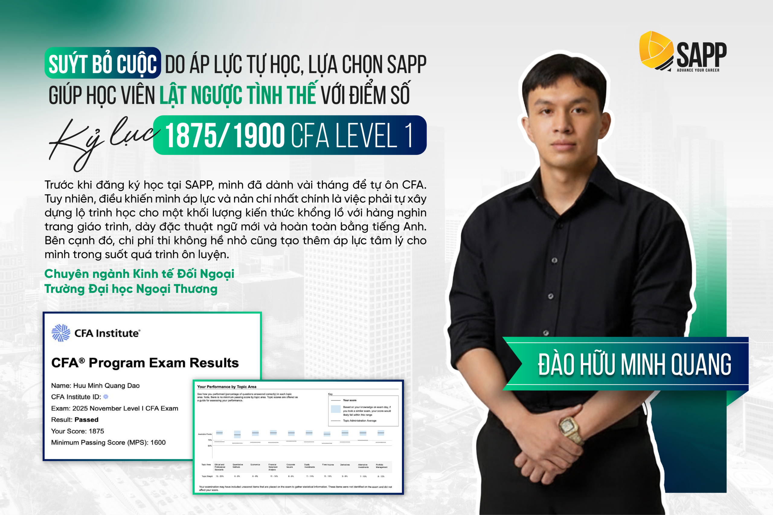 Với Minh Quang, hơn cả điểm số, hành trình chinh phục CFA Level 1 đã giúp bạn tìm ra được cách học phù hợp với bản thân. Sau một hành trình dài liên tục thử – sai – điều chỉnh, kết quả Top Score chính là minh chứng cho một quá trình học tập có định hướng, kỷ luật và khoa học. Một lần nữa, SAPP xin được chúc mừng Minh Quang và mong rằng bạn sẽ tiến xa hơn nữa trên con đường sự nghiệp tài chính – đầu tư của mình.