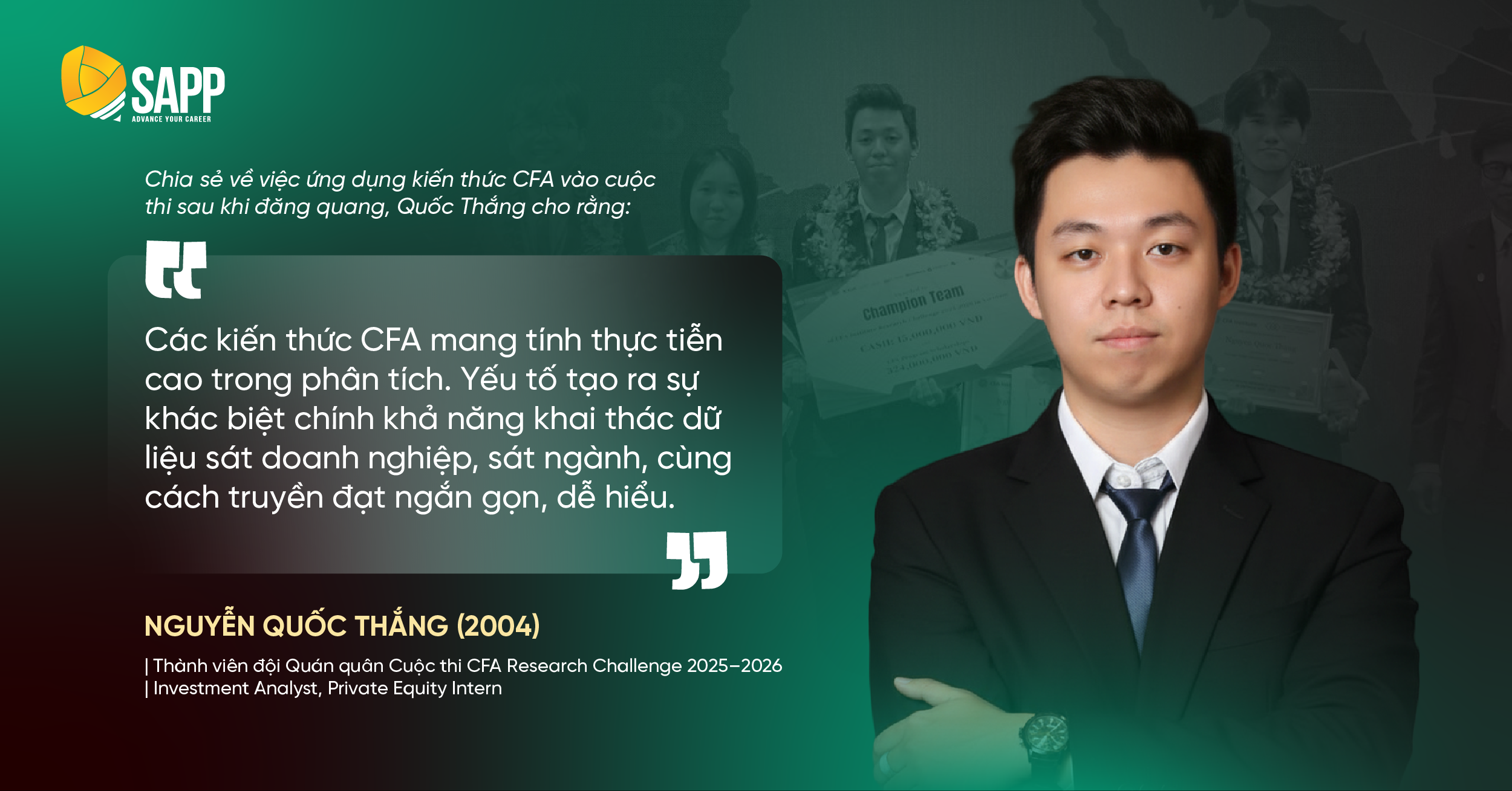 Cùng SAPP lắng nghe Nguyễn Quốc Thắng chia sẻ về hành trình xây dựng nền tảng chuyên môn CFA để từng bước vận dụng kiến thức, chuyển hoá thành lợi thế để giành ngôi vị cao nhất của cuộc thi CFA Research Challenge 2025-2026!