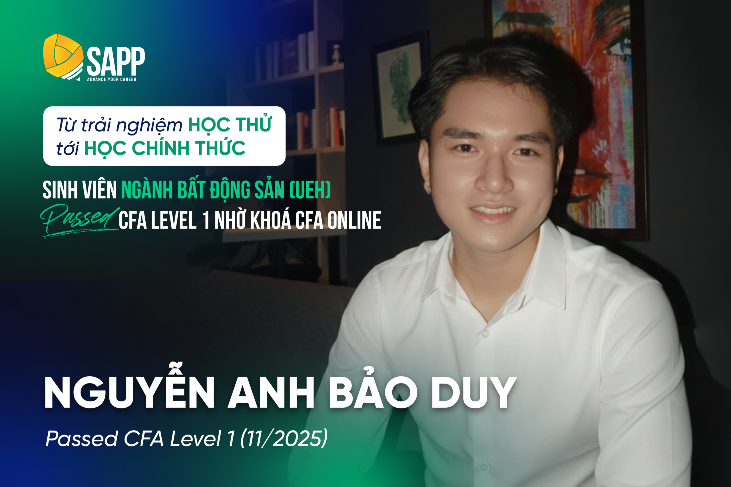 Nguyễn Anh Bảo Duy, sinh viên năm cuối ngành Bất động sản, Đại học Kinh tế TP.HCM (UEH) đã thành công vượt qua CFA Level 1 trong kỳ thi tháng 11/2025 vừa qua, đánh dấu một cột mốc quan trọng trên hành trình chinh phục chứng chỉ quốc tế trong lĩnh vực Tài chính – Đầu tư.