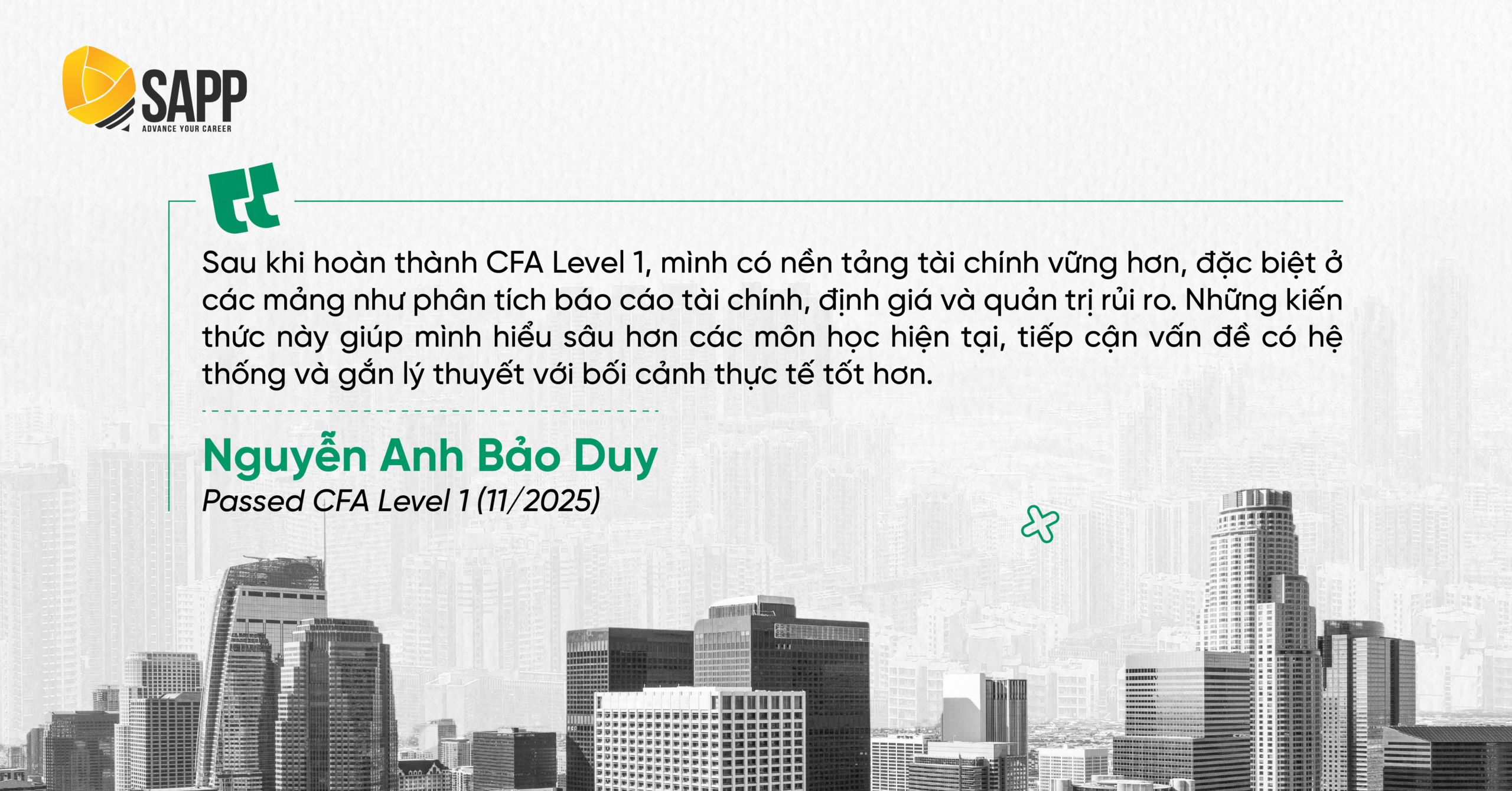 Một lần nữa, SAPP chúc mừng Nguyễn Anh Bảo Duy đã thành công vượt qua CFA Level 1. Chúc Bảo Duy sẽ tiếp tục giữ vững tinh thần học tập bền bỉ, từng bước chinh phục các level tiếp theo của CFA. Hy vọng hành trình phía trước của Duy sẽ luôn được xây dựng trên mục tiêu rõ ràng để phát triển bền vững trong lĩnh vực Tài chính – Đầu tư.