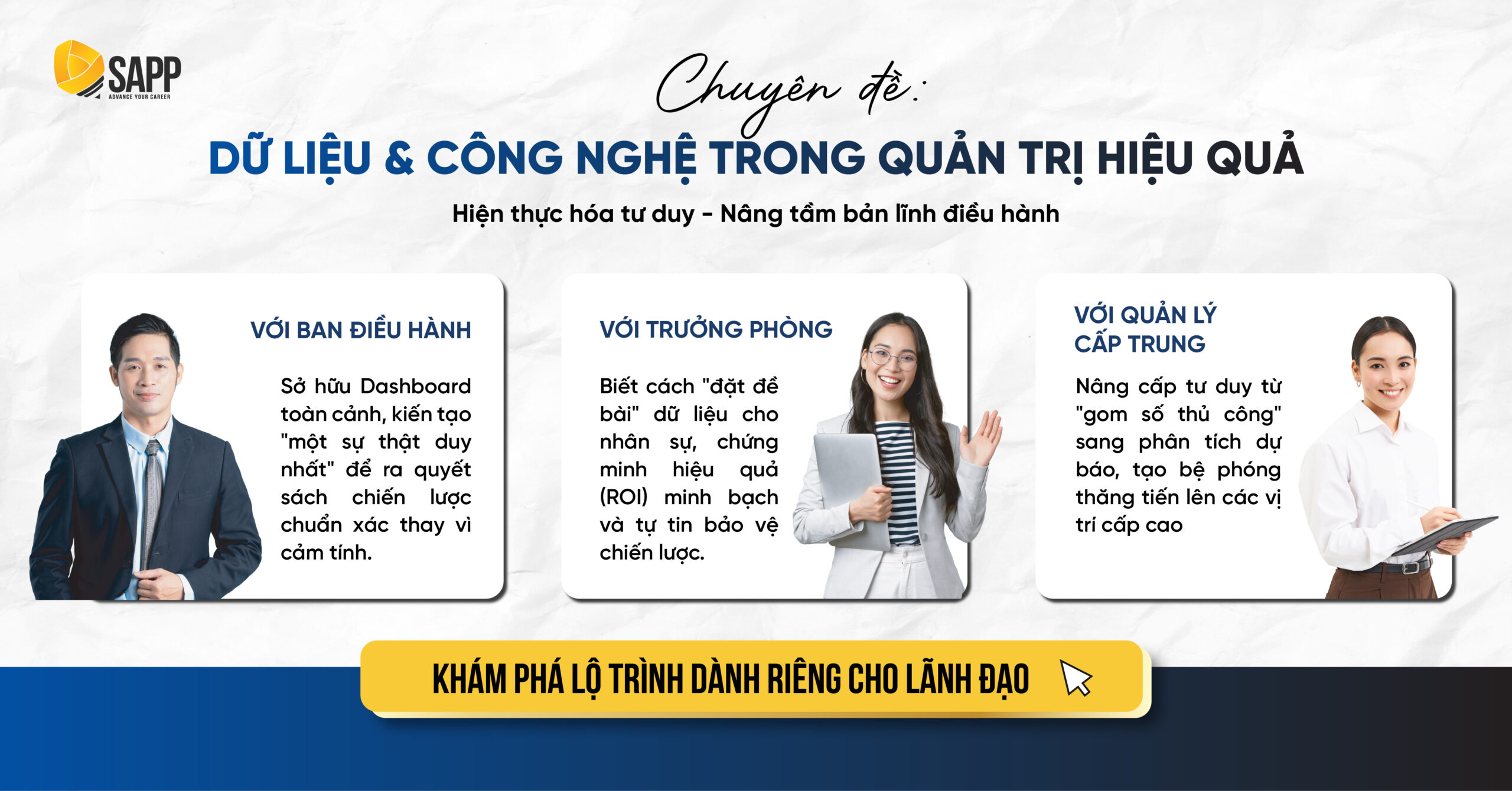 Nhằm giúp các Lãnh đạo không chuyên về công nghệ có thể tự tin làm chủ kiến trúc hệ thống thông tin, SAPP Academy giới thiệu chuyên đề chuyên sâu: “Dữ Liệu & Công Nghệ Trong Quản Trị Hiệu Quả”. Khóa học loại bỏ hoàn toàn các thao tác phần mềm phức tạp, tập trung 100% vào lăng kính quản trị để mang lại sự chuyển đổi sâu sắc cho từng cấp bậc điều hành: