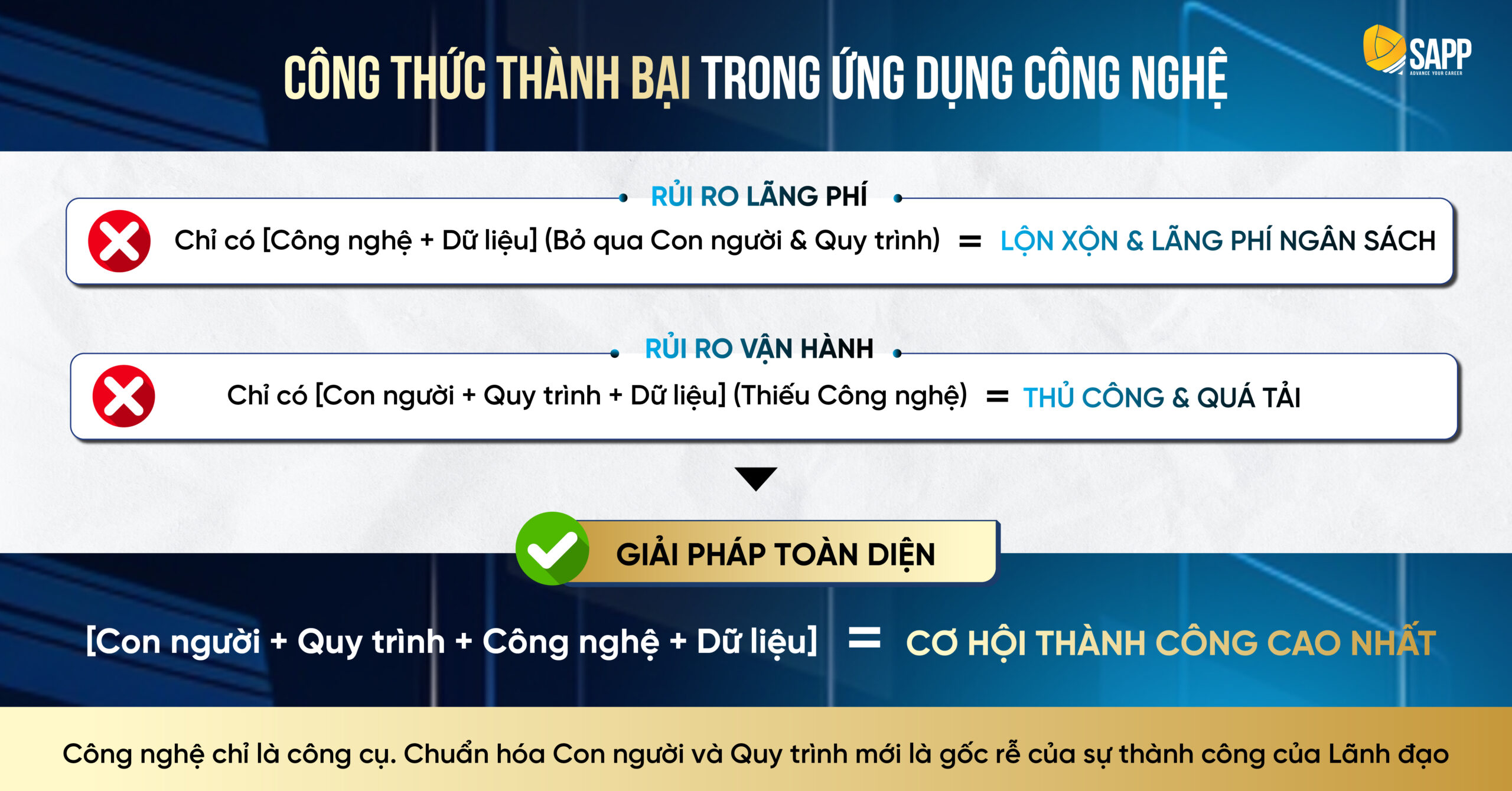 Sự thành bại của quá trình ứng dụng hệ thống thông tin nằm ở một công thức vận hành bất di bất dịch: Con người + Quy trình + Công nghệ + Dữ liệu = Cơ hội thành công cao nhất.
