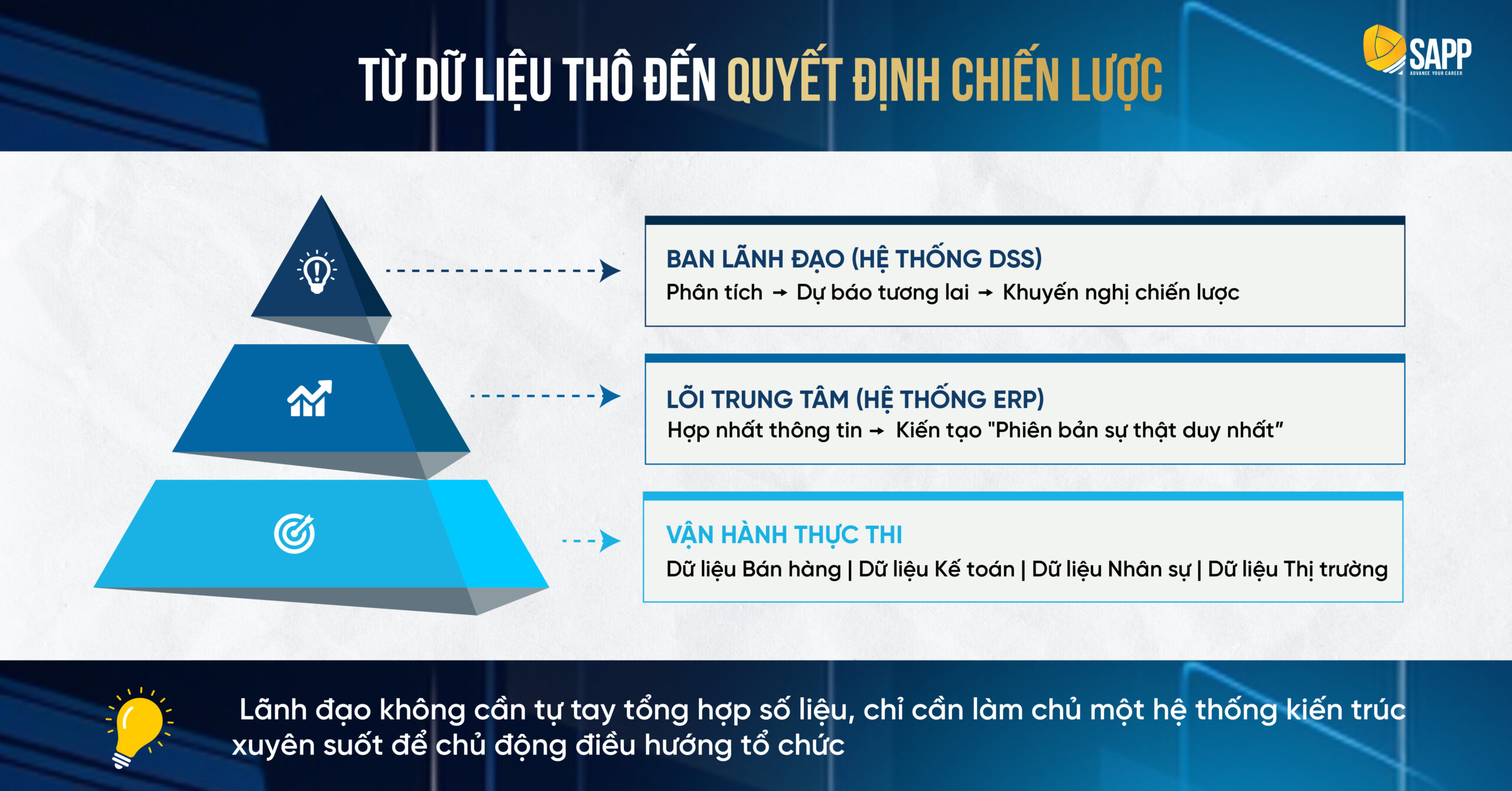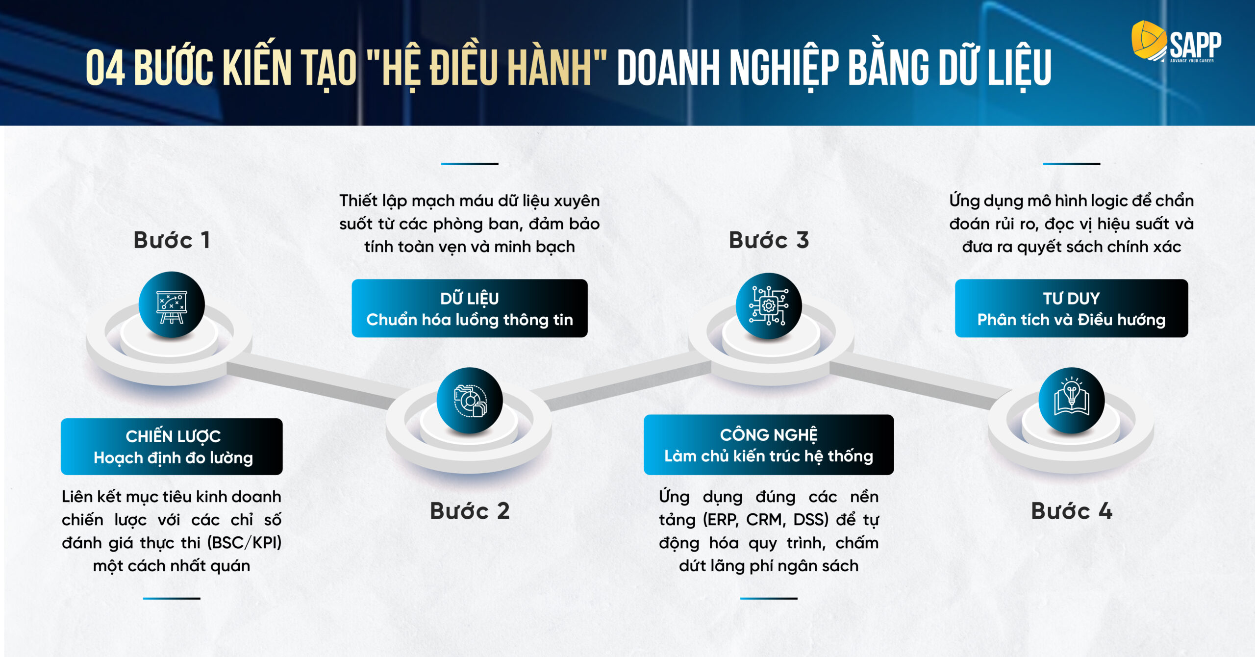 Nhằm hệ thống hóa phương pháp luận trên, SAPP Academy thiết kế chuyên đề “Dữ Liệu & Công Nghệ Trong Quản Trị Hiệu Quả” dành riêng cho cấp quản lý không chuyên về kỹ thuật IT. Khóa học loại bỏ các thao tác phần mềm phức tạp, tập trung vào 4 trọng tâm cốt lõi để nâng cấp tư duy: