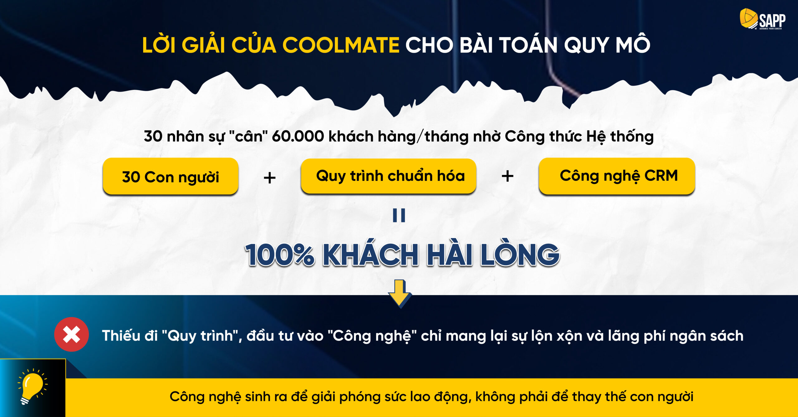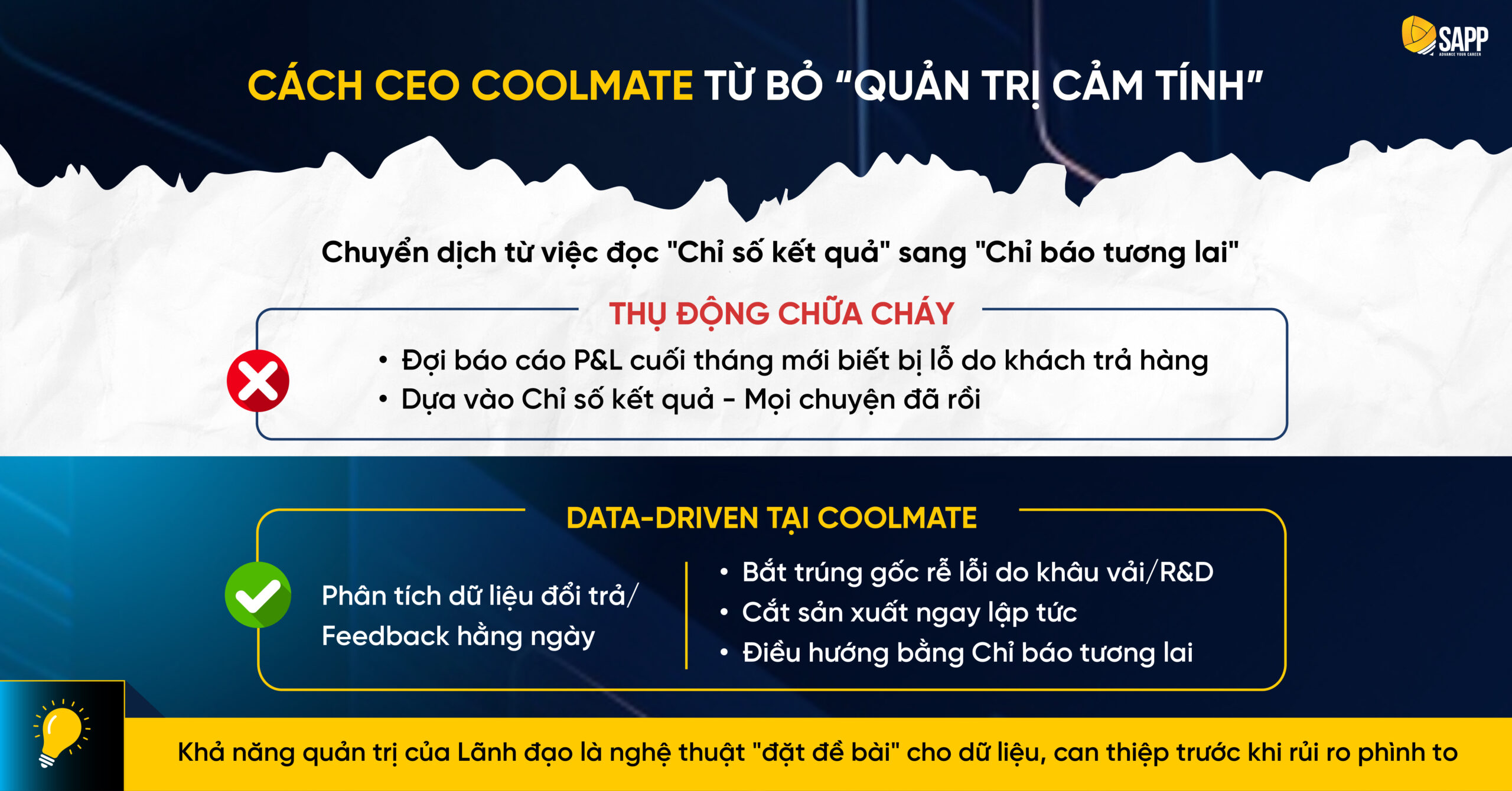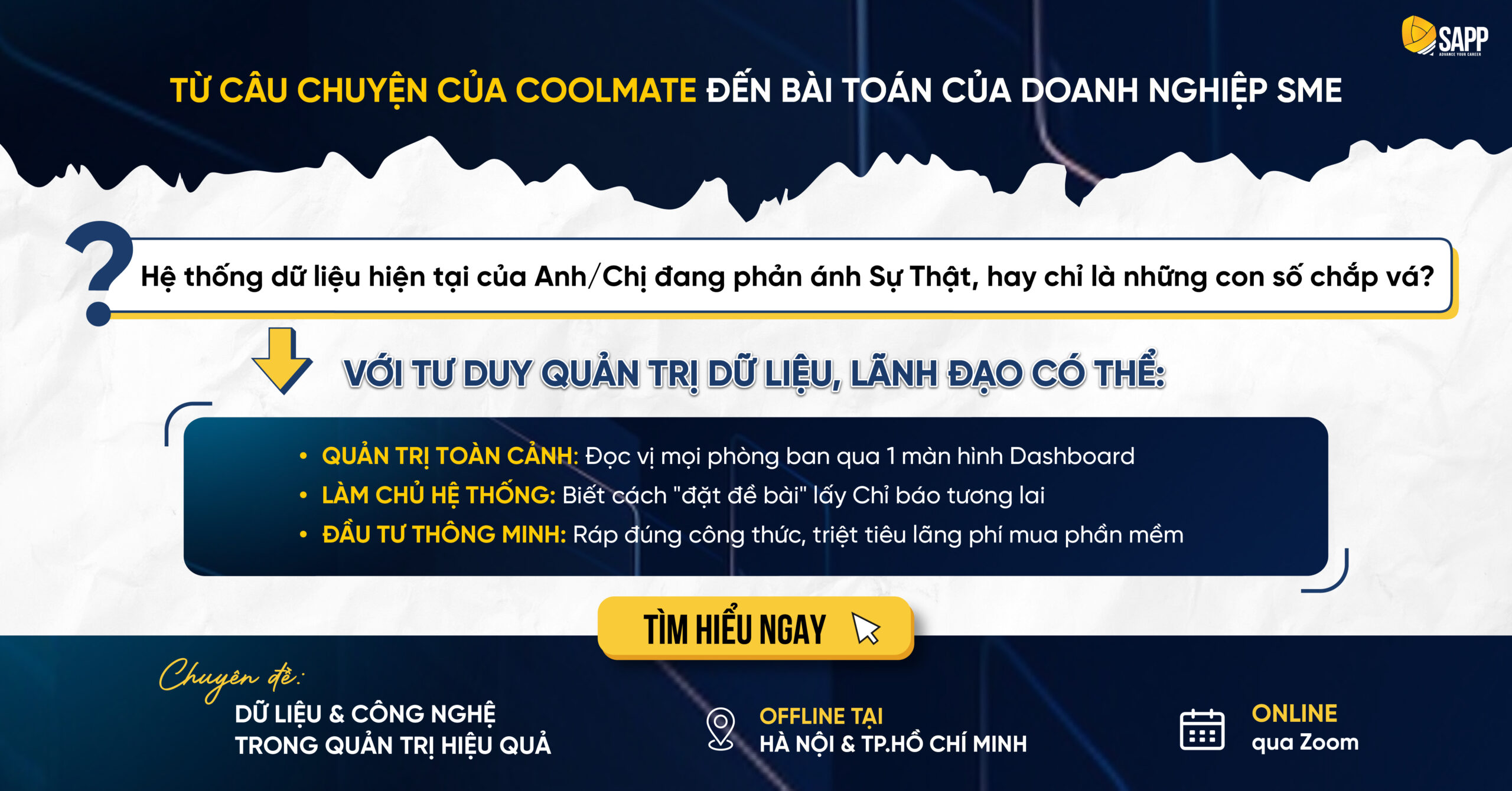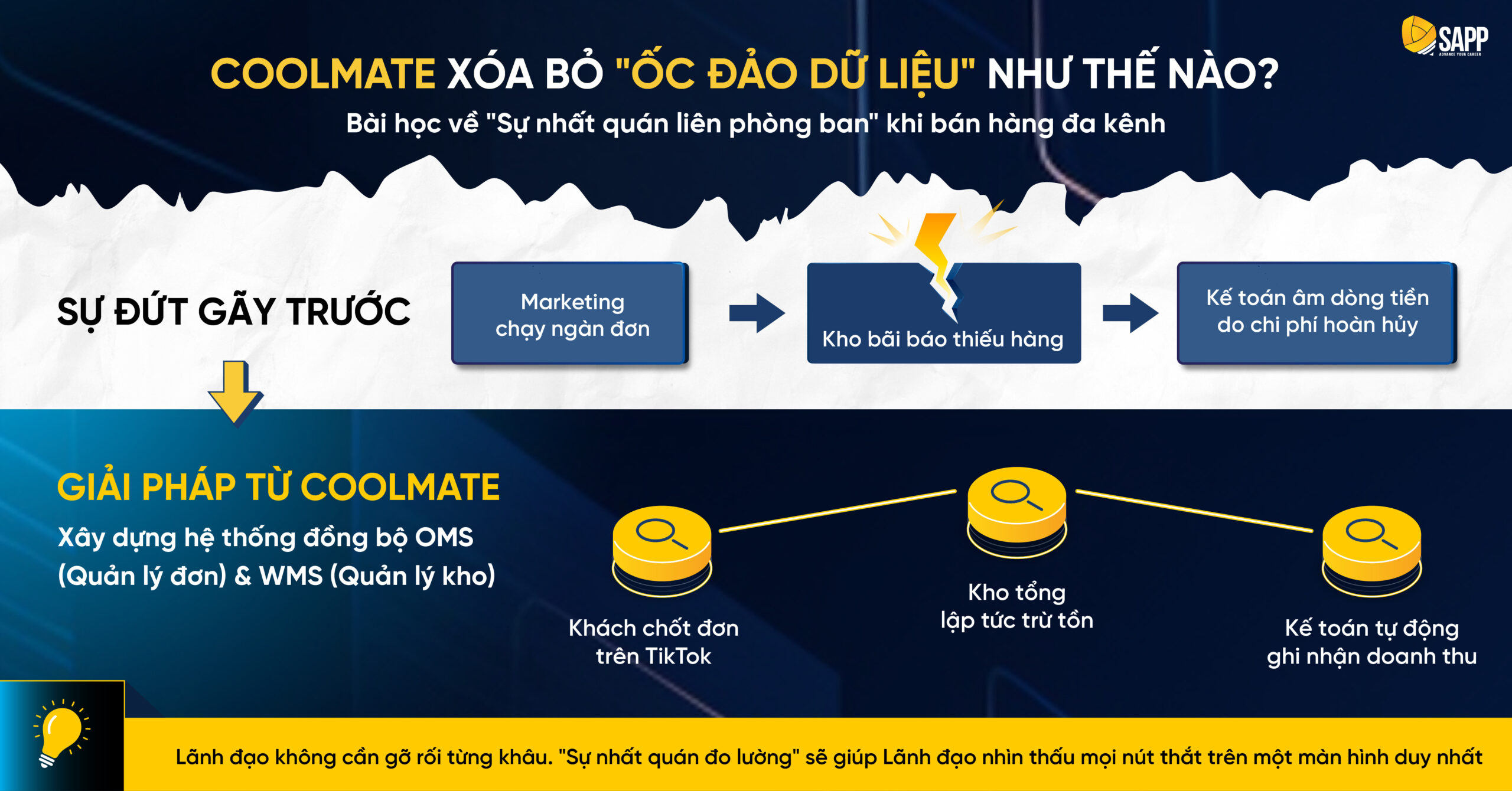 Hành trình tháo gỡ điểm nghẽn để tạo ra cú “quay xe” tăng trưởng 30% đầy ngoạn mục và bền vững của Coolmate mang lại những đúc kết rất thực tế. Thông qua lăng kính của chuyên đề “Dữ liệu & Công nghệ trong quản trị hiệu quả”, SAPP Academy sẽ cùng Anh/Chị Lãnh đạo bóc tách câu chuyện này, qua đó gợi mở thêm những góc nhìn mới để thiết lập một hệ thống vận hành trơn tru cho chính doanh nghiệp mình.