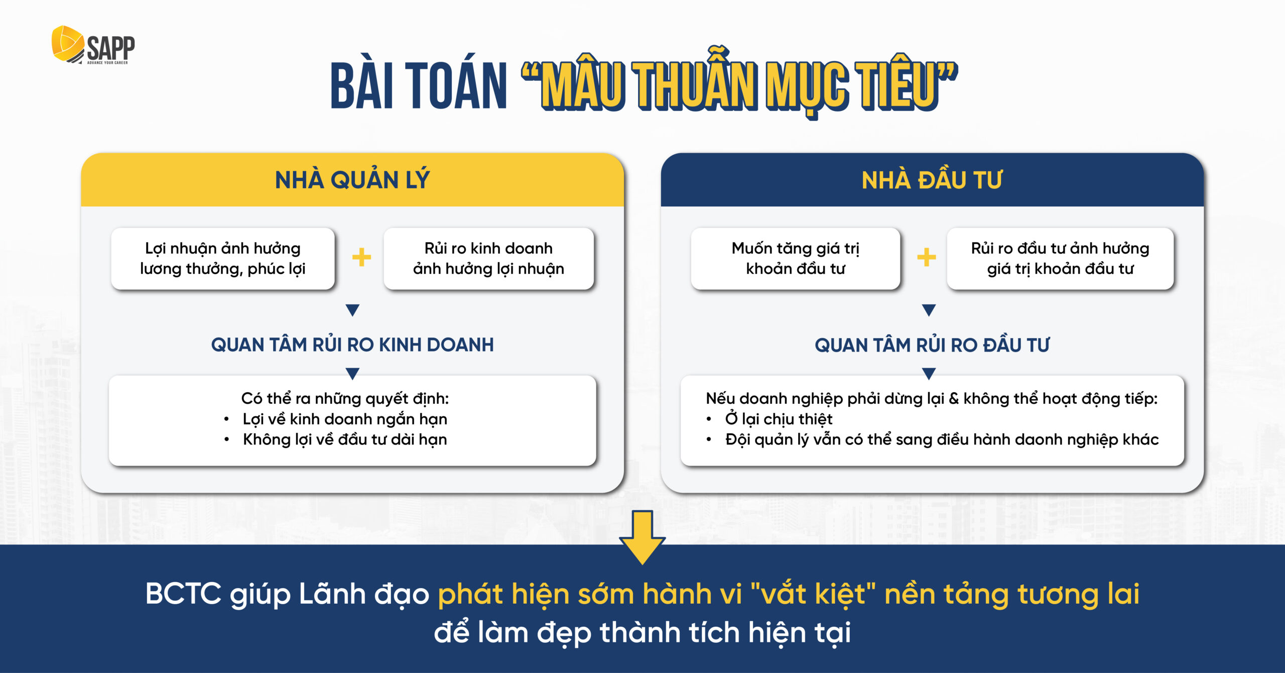 Một trong những thách thức lớn nhất của người đứng đầu (Nhà đầu tư/Chủ sở hữu) là làm sao để đội ngũ Quản lý điều hành làm việc nhất quán với mục tiêu dài hạn của công ty. Sự lệch pha này được thể hiện rất rõ qua cách hai nhóm đối tượng tiếp cận BCTC: