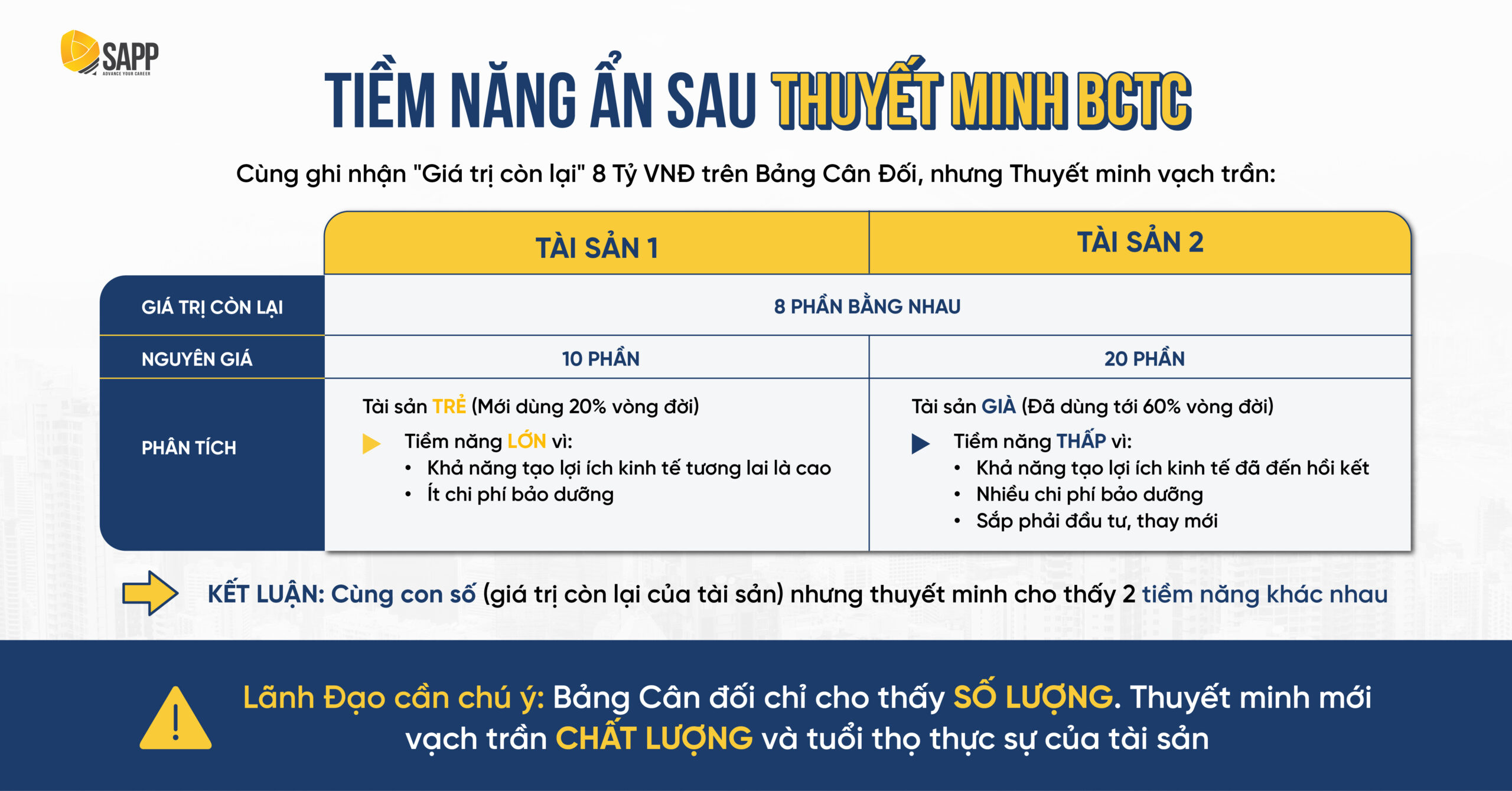 ➤ Chuyên đề “Phân Tích Chuyên Sâu Báo Cáo Tài Chính” tại SAPP sẽ rèn luyện cho Lãnh đạo thói quen: BCTC chỉ phản ánh con số tổng, Thuyết minh mới kể câu chuyện về chất lượng. Nắm vững kỹ năng đọc Thuyết minh, Anh/Chị sẽ đánh giá đúng năng lực sản xuất thực tế, từ đó hoạch định chính xác dòng tiền tái đầu tư mà không bị đánh lừa bởi những “ảo ảnh” tài sản.