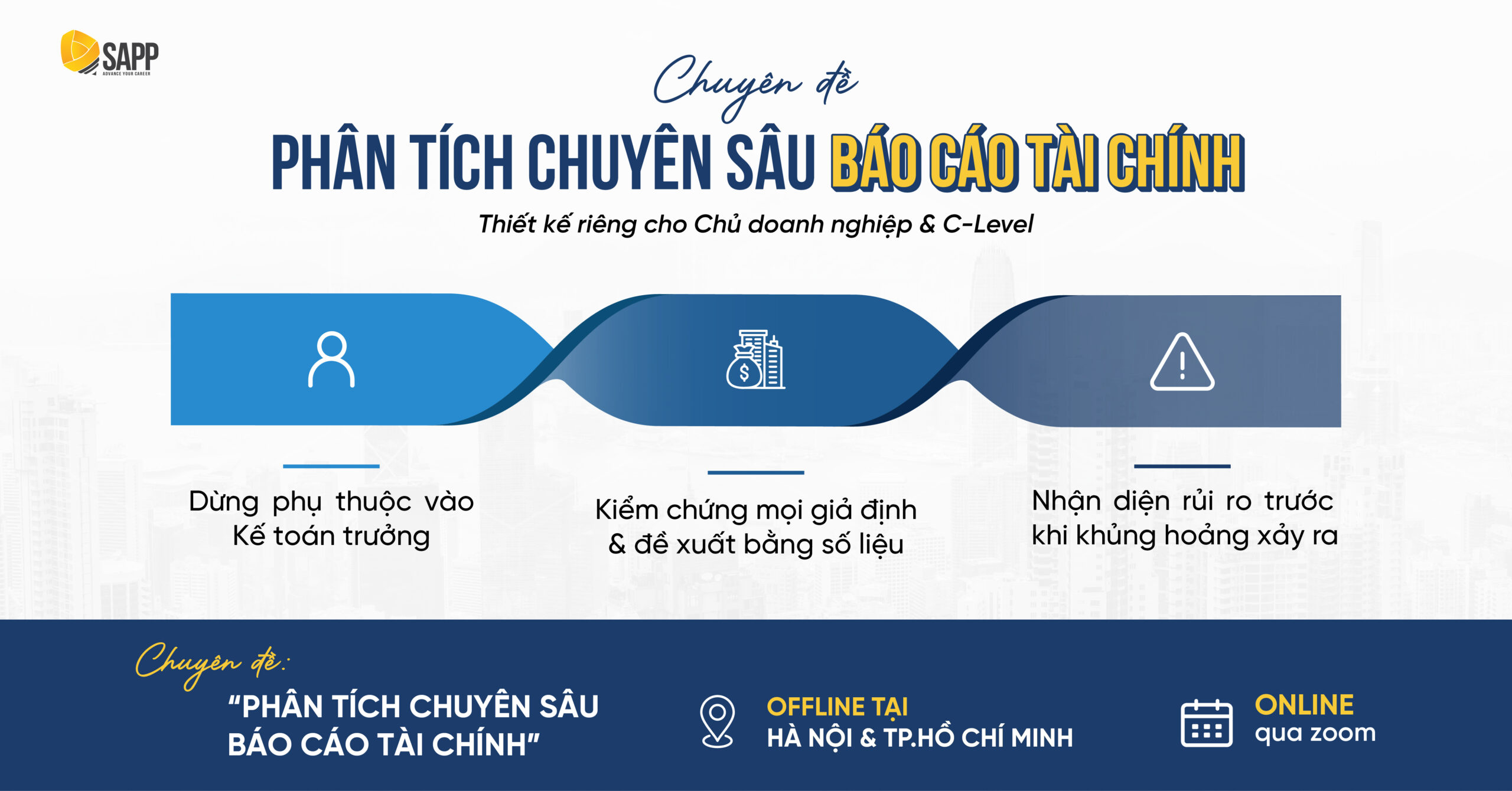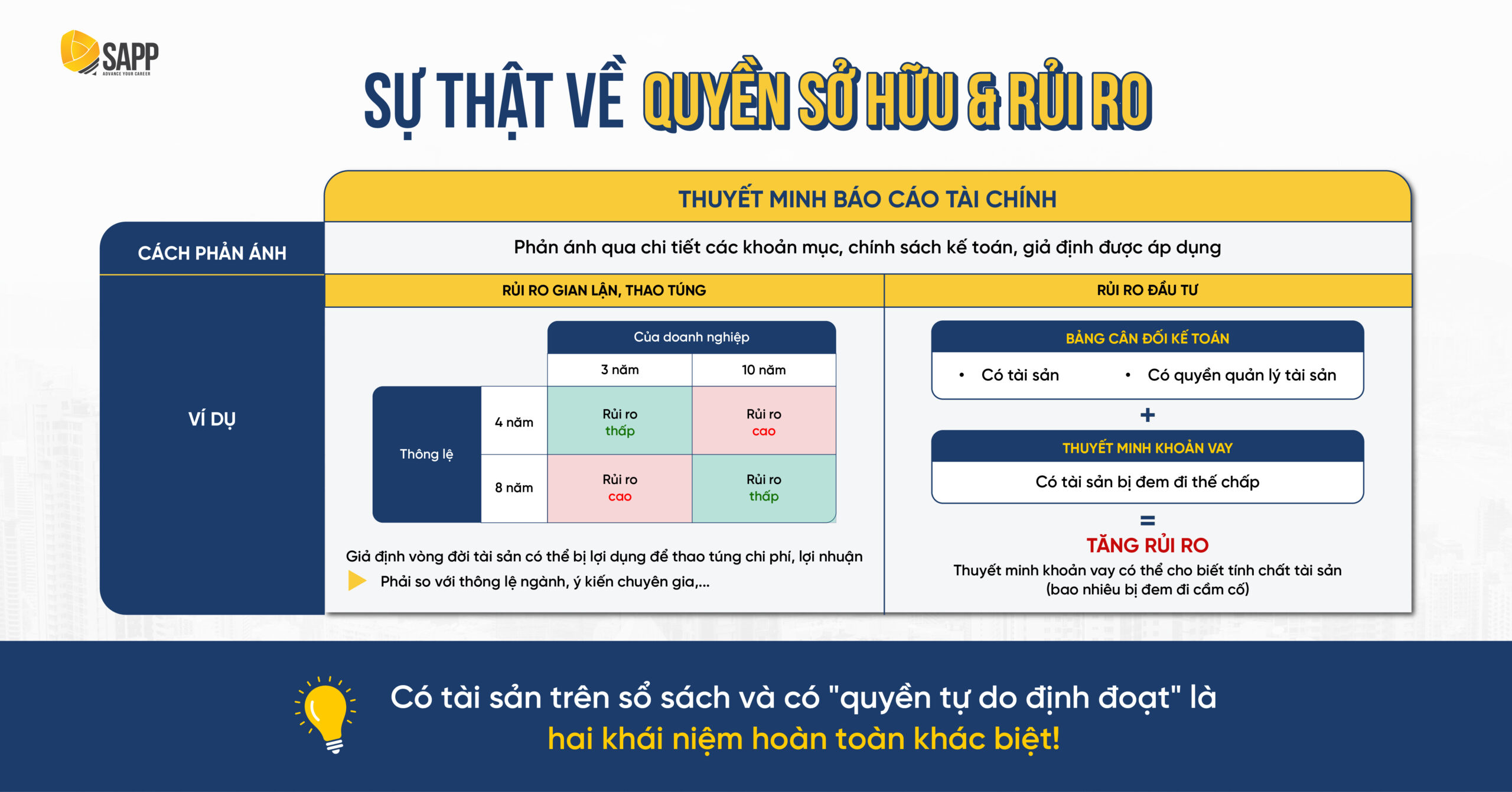 ➤ Chuyên đề “Phân Tích Chuyên Sâu Báo Cáo Tài Chính” tại SAPP sẽ giúp Lãnh đạo hiểu rằng việc có tài sản trên sổ sách và việc có “quyền tự do định đoạt” tài sản đó là hai khái niệm hoàn toàn khác biệt. Khi tham gia chuyên đề, Anh/Chị sẽ được trang bị tư duy phòng thủ của một Giám đốc Tài chính. Năng lực đọc thấu Thuyết minh giúp Lãnh đạo đánh giá chính xác mức độ tự chủ tài chính, ngăn ngừa các rủi ro pháp lý và đảm bảo an toàn thanh khoản cho toàn hệ thống trước khi khủng hoảng xảy ra.